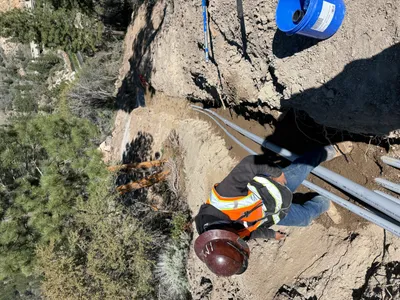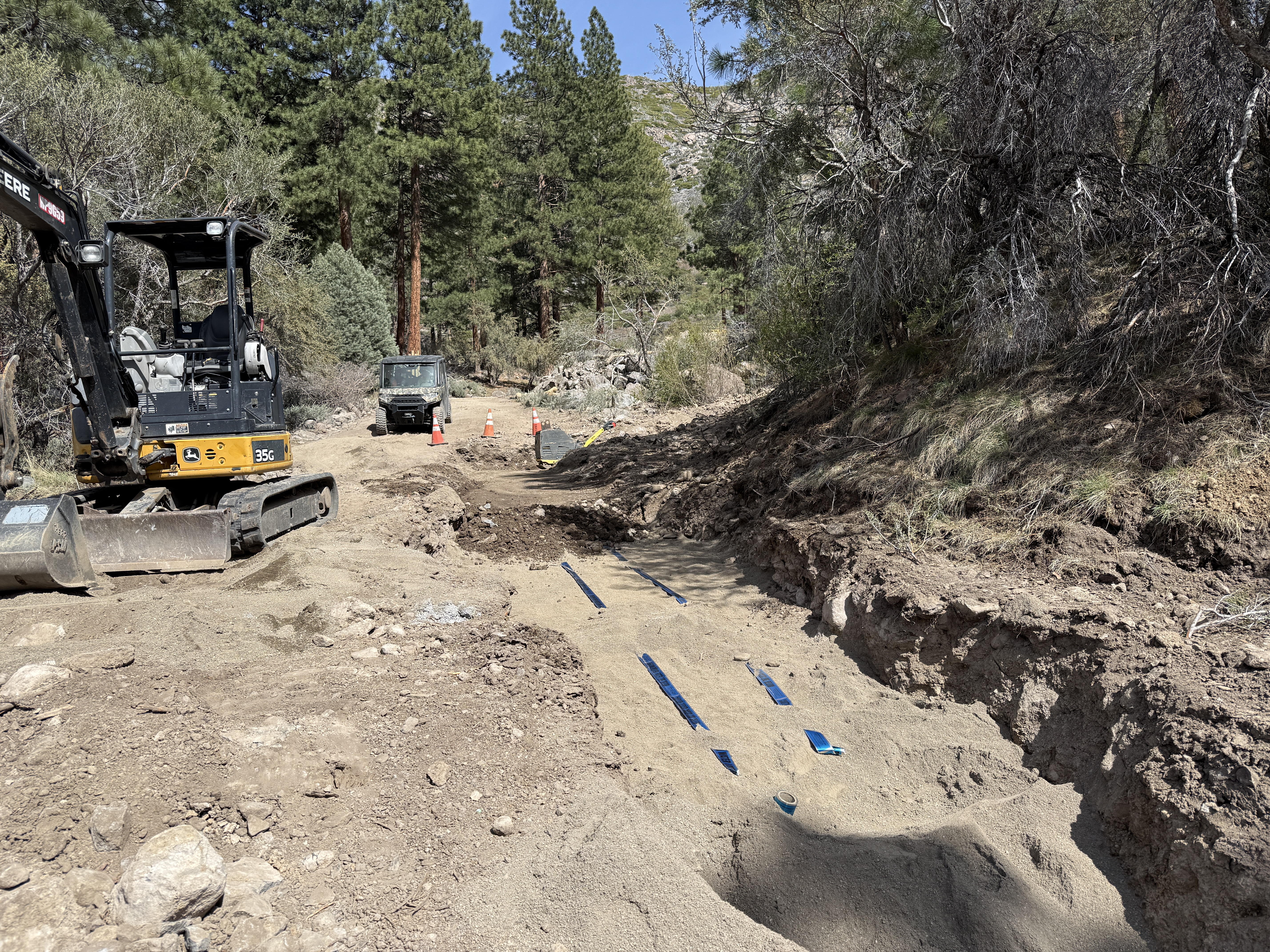 The image shows a trenching operation with an excavator on the left side of a rugged dirt pathway. There is a shallow trench with visible blue trench protection strips on the right. Traffic cones and a utility vehicle can also be seen further down the pathway, indicating ongoing work. The area is surrounded by trees and the terrain appears uneven.