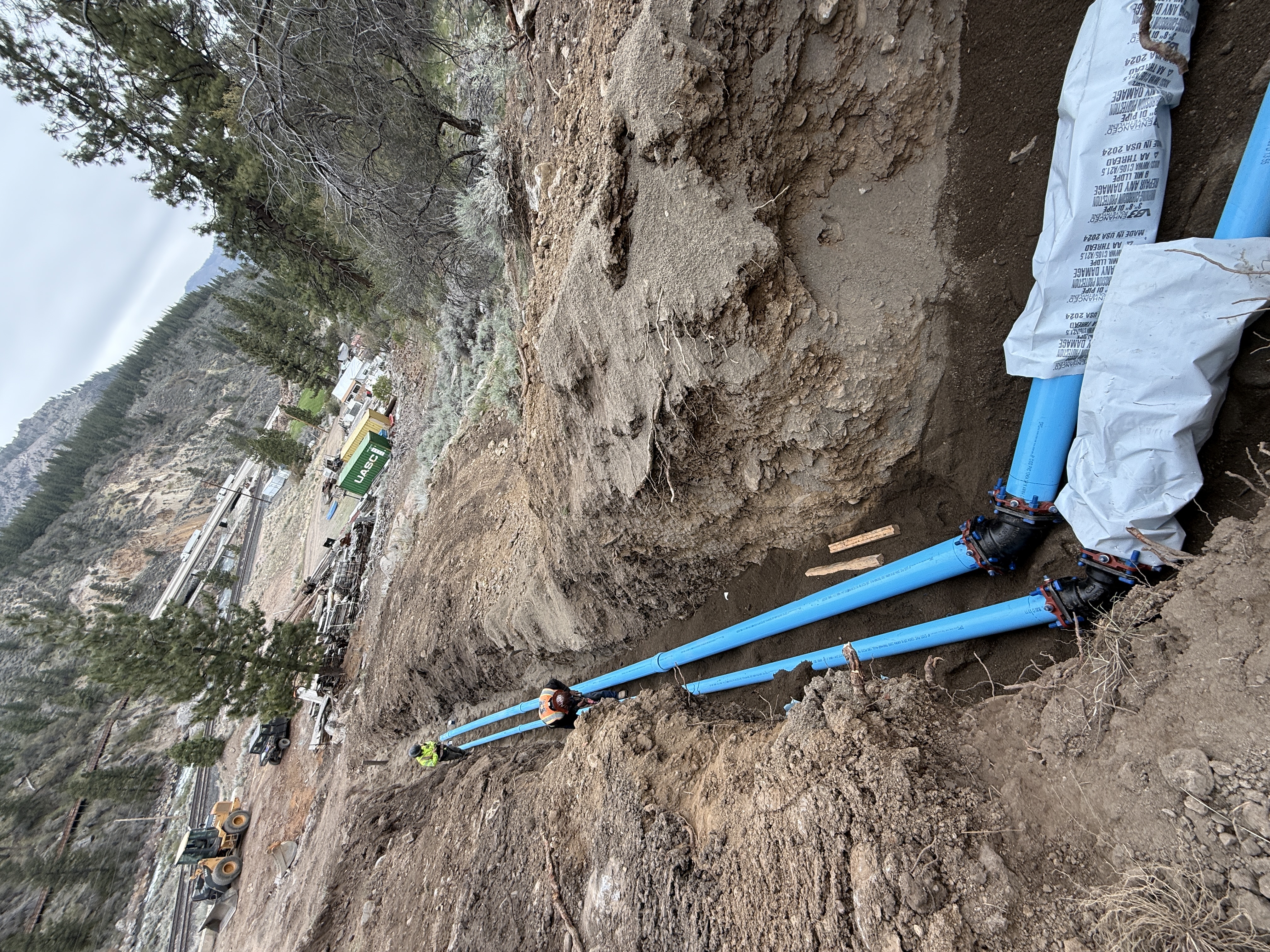 dirt trench and hillside overcast conditions equipment and vehicles staged around trench