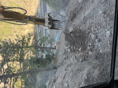 rocky soil with open trench cloudy conditions equipment and materials staged around site