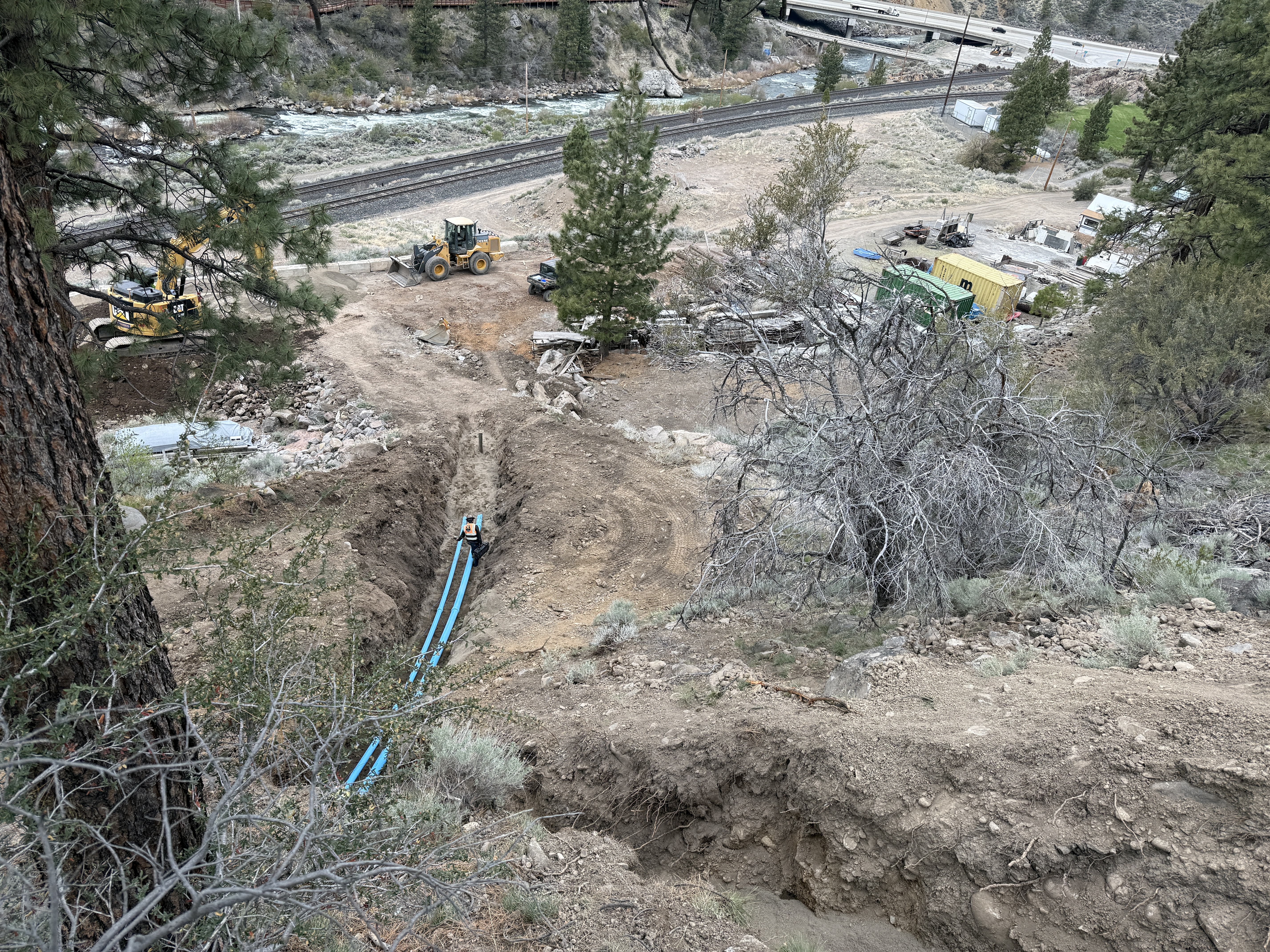 The image shows a trench with blue piping being installed down a slope. An excavator and a loader are positioned near the top center, and a backhoe is present at the trench's bottom. Surrounding the trench are trees and rocky soil with visible railroad tracks in the background. Construction materials and equipment are staged around the work area.
