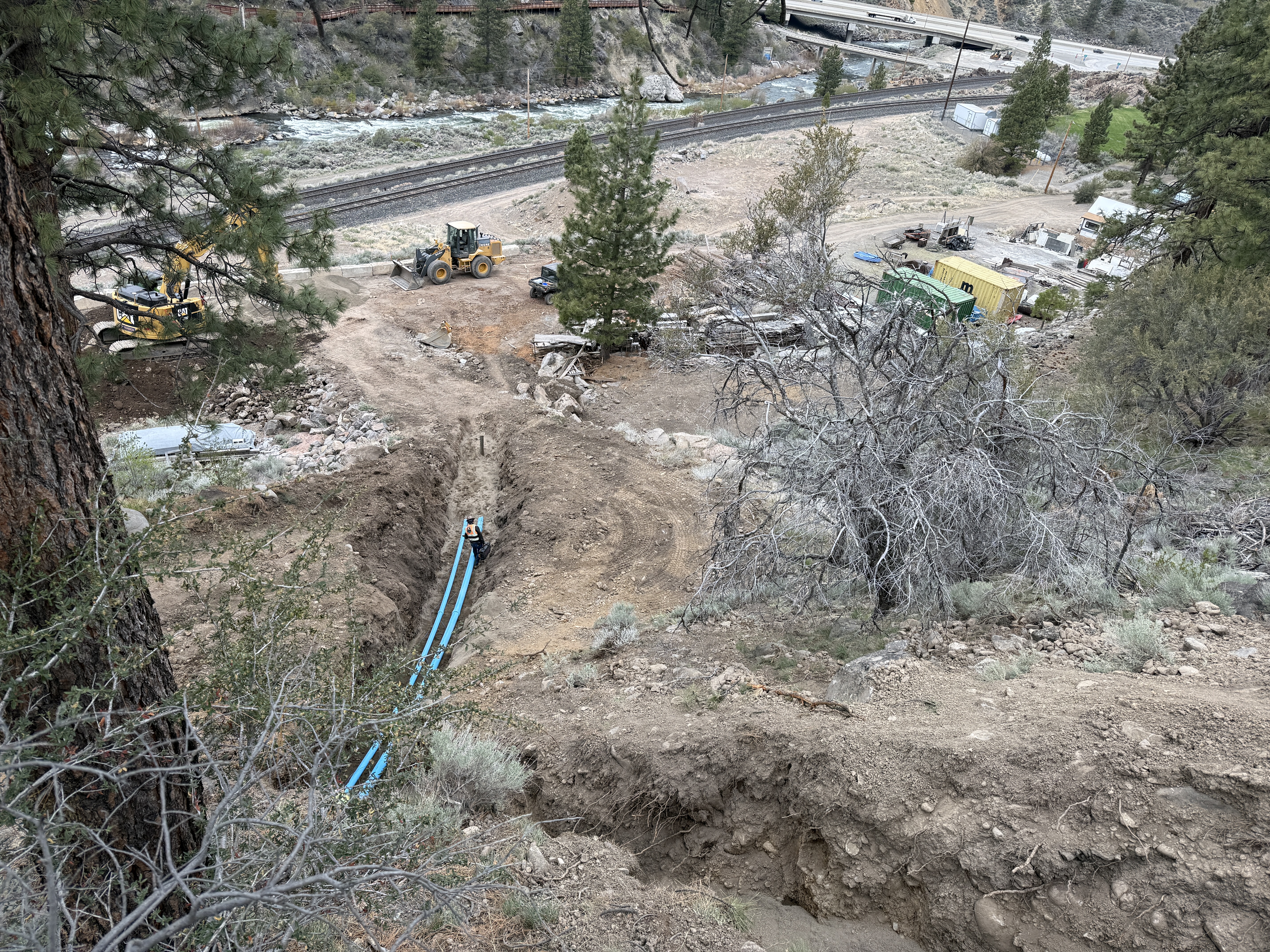 The image shows a trench running from the foreground down towards a construction area where heavy equipment is present. A blue pipe is being installed in the trench. Construction equipment such as an excavator and a loader can be seen near the worksite. The surrounding area has uneven ground, indicating active excavation or trenching work.
