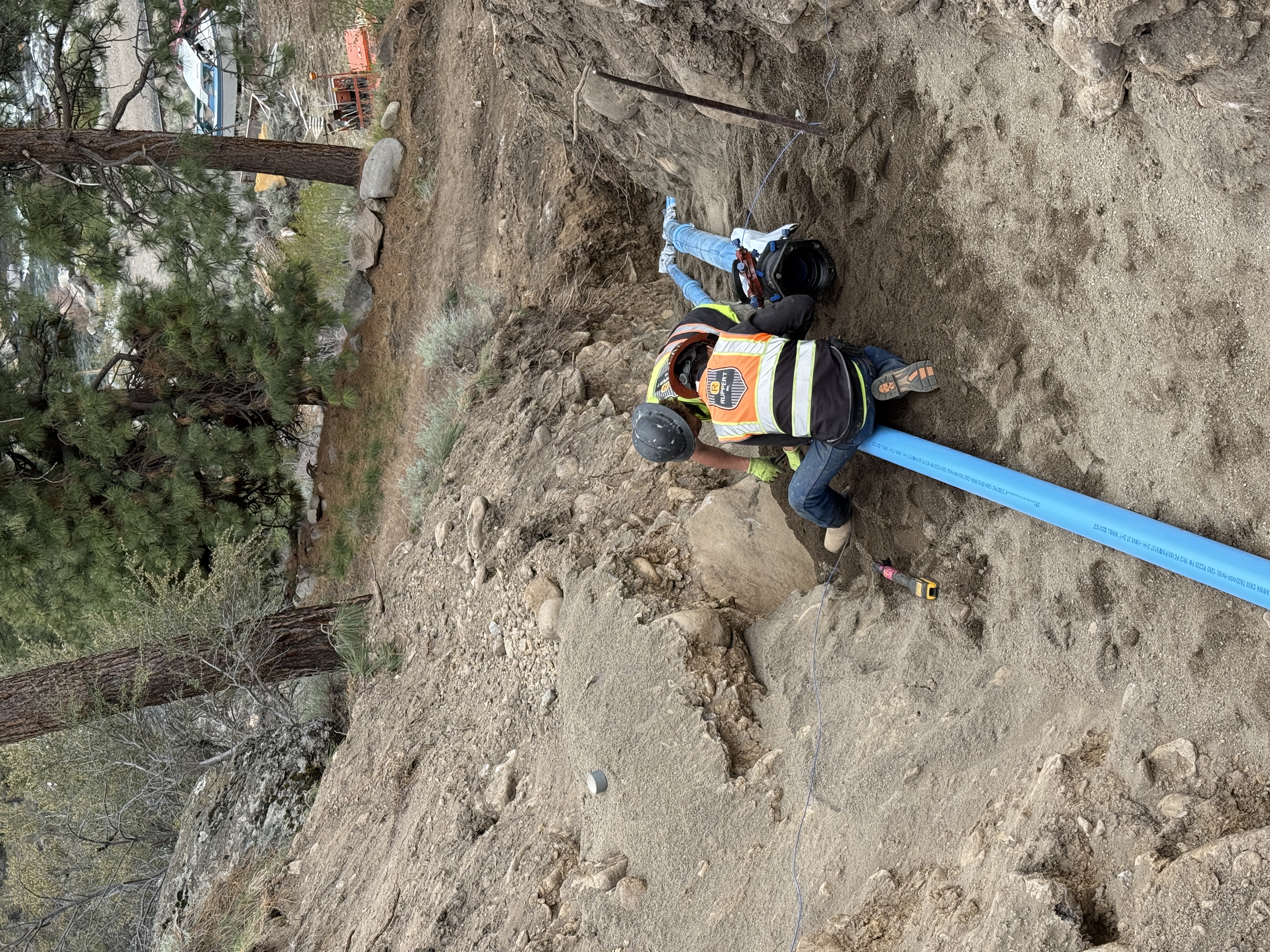 Two workers are seen in a trench working to install blue pipes. One worker is using equipment to join or secure the pipes. The trench is surrounded by dirt and rocks, with some vegetation visible in the background. The workers are wearing necessary safety gear including hard hats and hi-visibility vests.