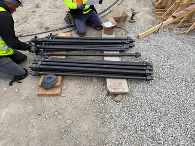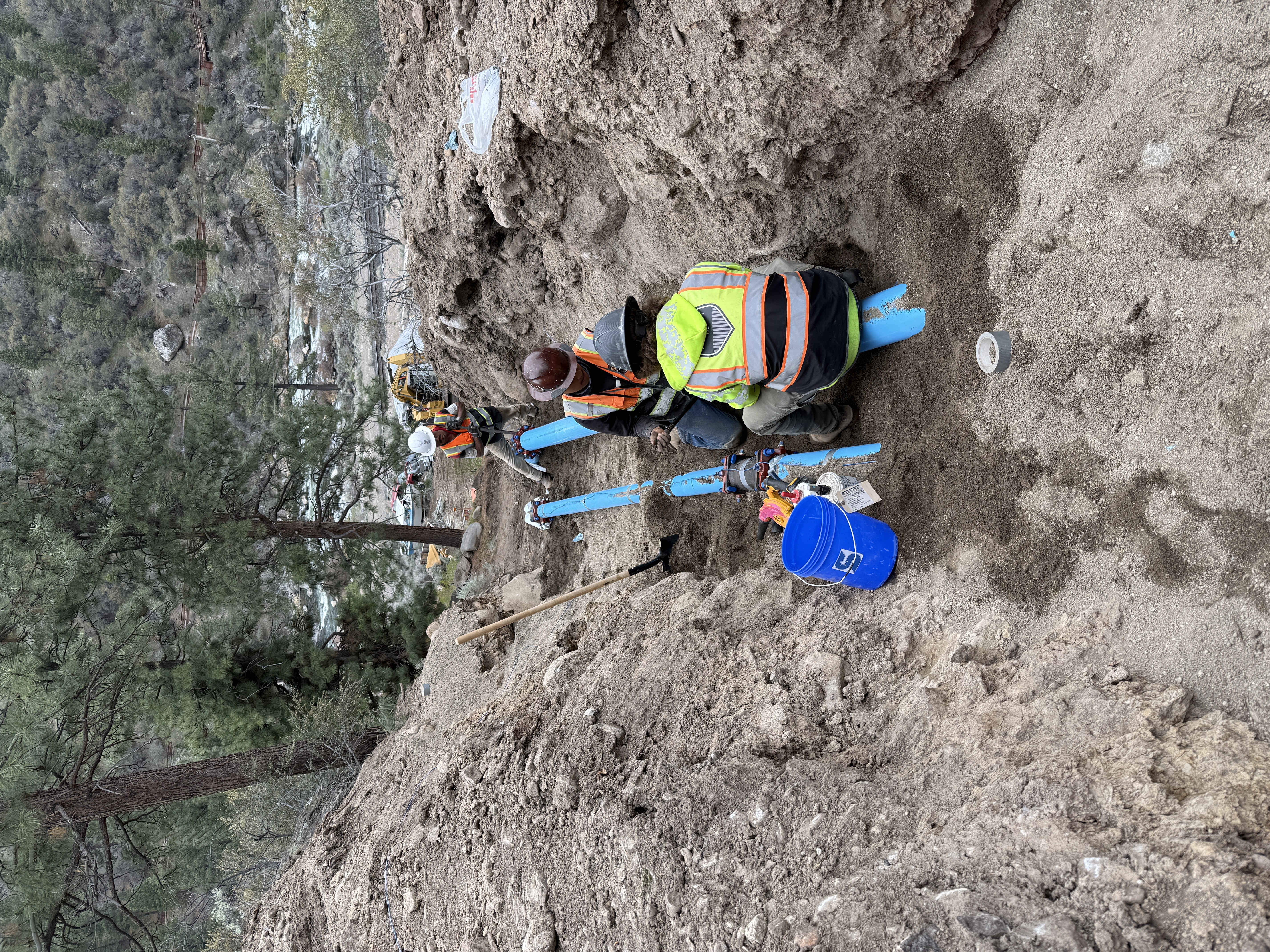 Two workers in an open trench are installing blue pipes. The trench is dug into a sloped, rocky area with trees visible in the background. A blue bucket and hand tools are beside the workers, who are wearing hard hats and hi-vis vests. The trench is lined with loose soil, indicating recent excavation.