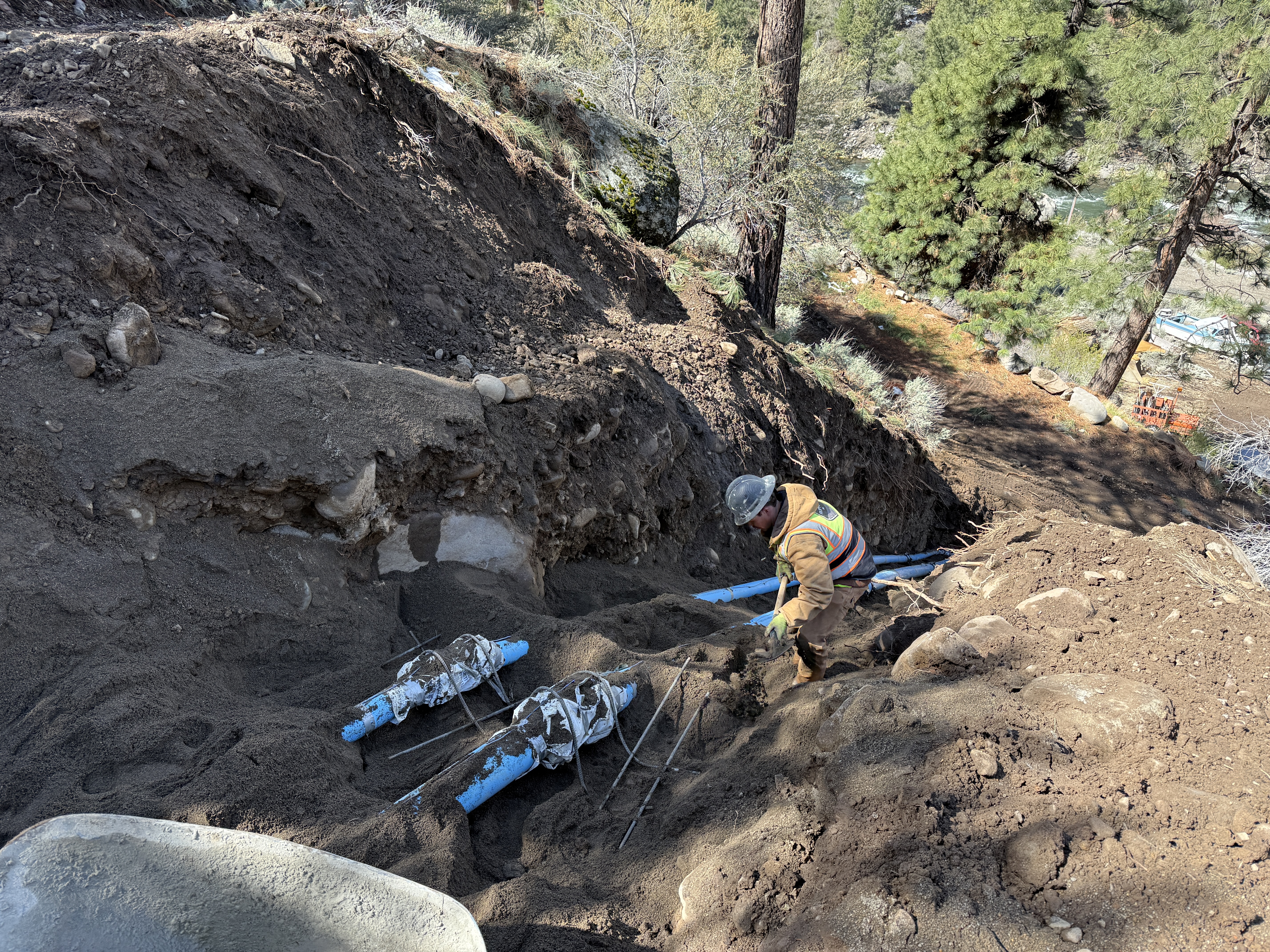 The image shows a worker wearing safety gear on a steep slope, engaged in placing or adjusting blue pipes embedded in the soil. The slope has loose soil and rocks, with some vegetation visible in the background. Blue pipes appear to be part of a pipeline, secured with metal stakes. The worker is using hand tools to manipulate the soil around the pipes.