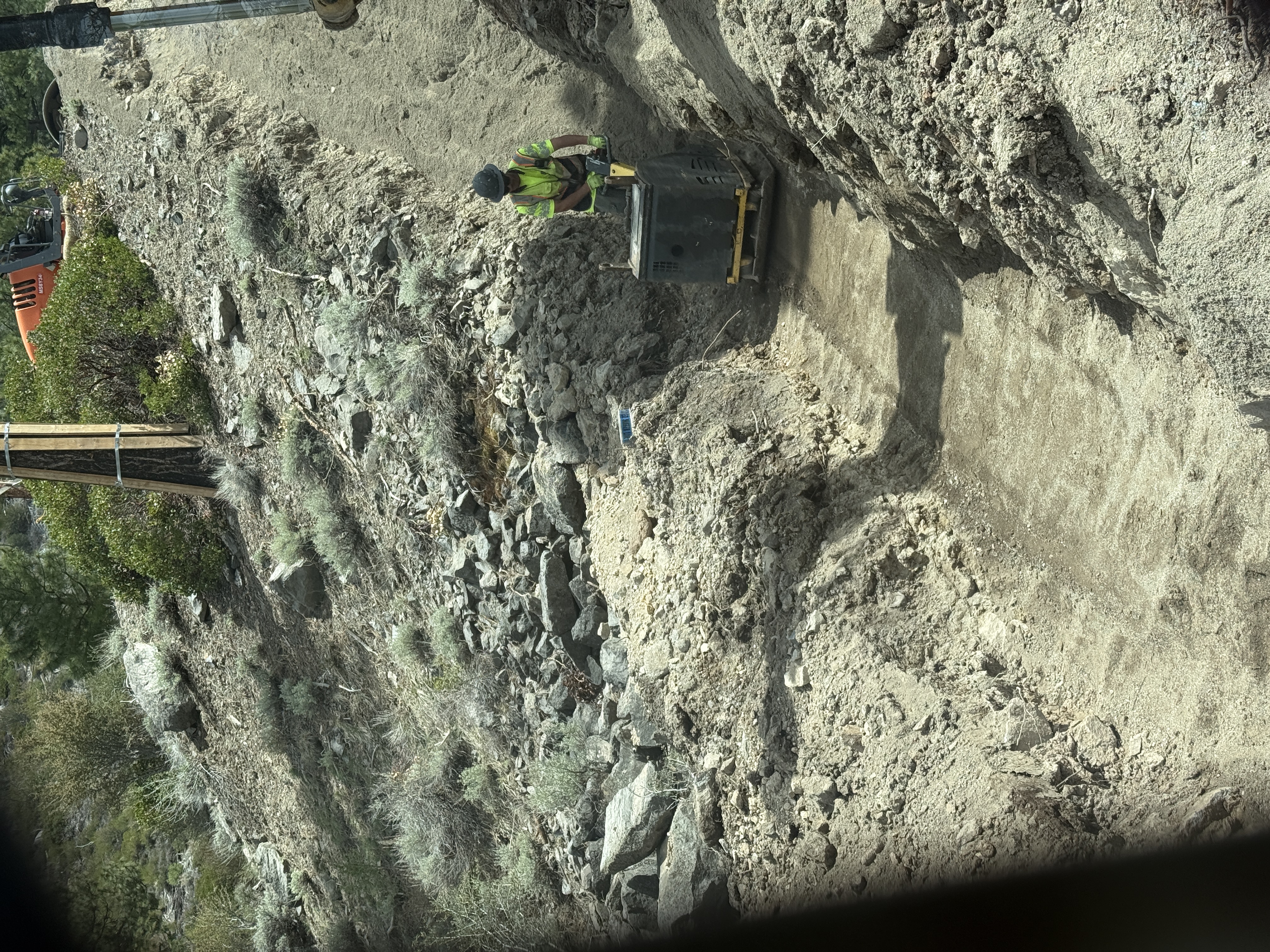 A worker wearing a hard hat and hi-vis vest is operating a plate compactor in a trench. The trench runs along a slope with loose soil and rocky terrain. An excavator is partially visible in the upper section of the image. The area is surrounded by natural vegetation, and utility poles are present.