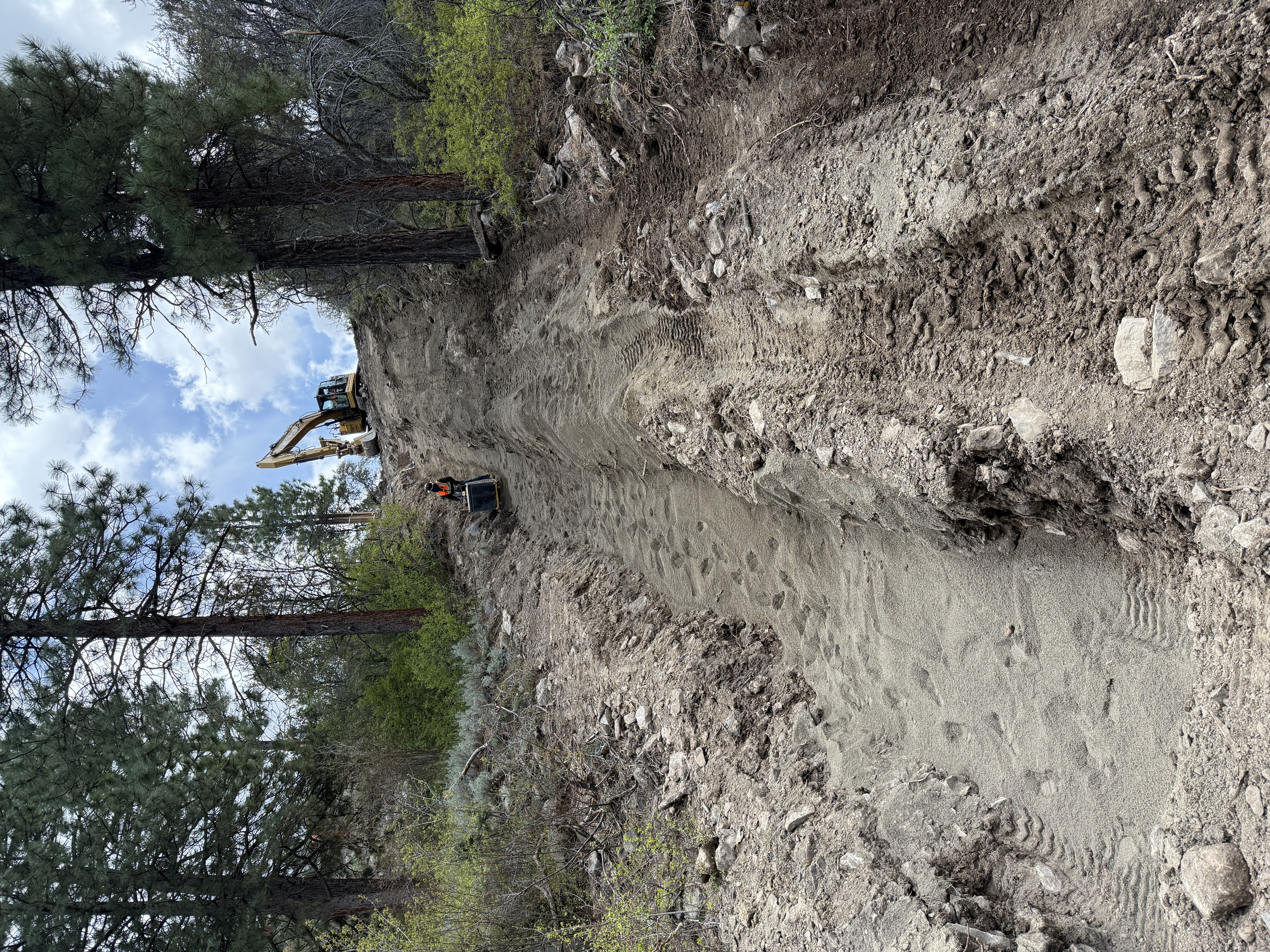 The image shows a steep, excavated dirt slope with a worker using a power tool or small machine. An excavator is positioned at the top of the slope. Footprints and machinery tracks are visible on the recently disturbed soil. Trees are present on both sides of the excavation area.