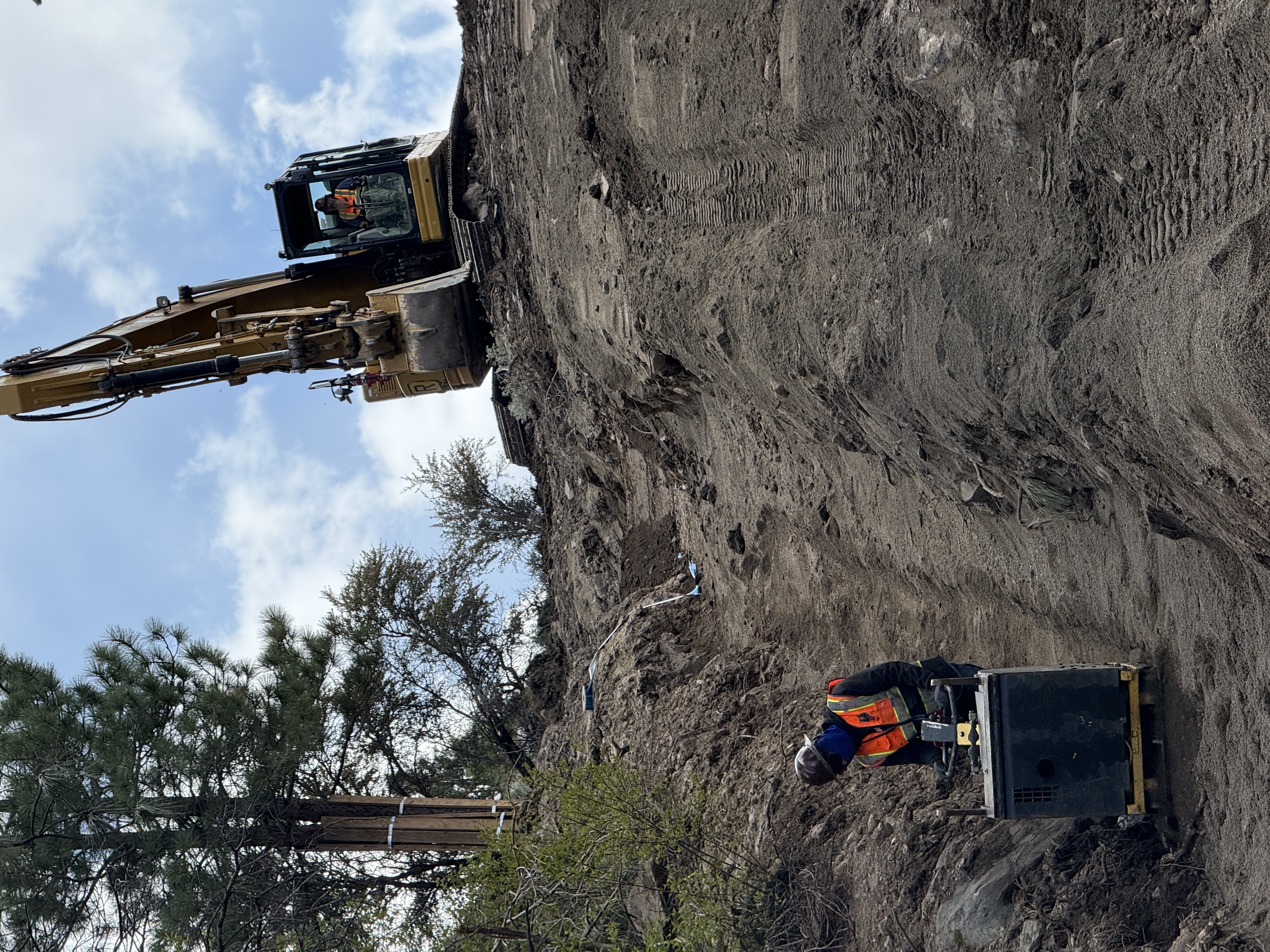 The image shows a worker operating a compaction machine on a sloped trench. An excavator is positioned at the top of the slope, indicating active earthmoving. The terrain is uneven, with visible loose soil and rocks. The worker is wearing a hard hat, hi-vis vest, and work boots.