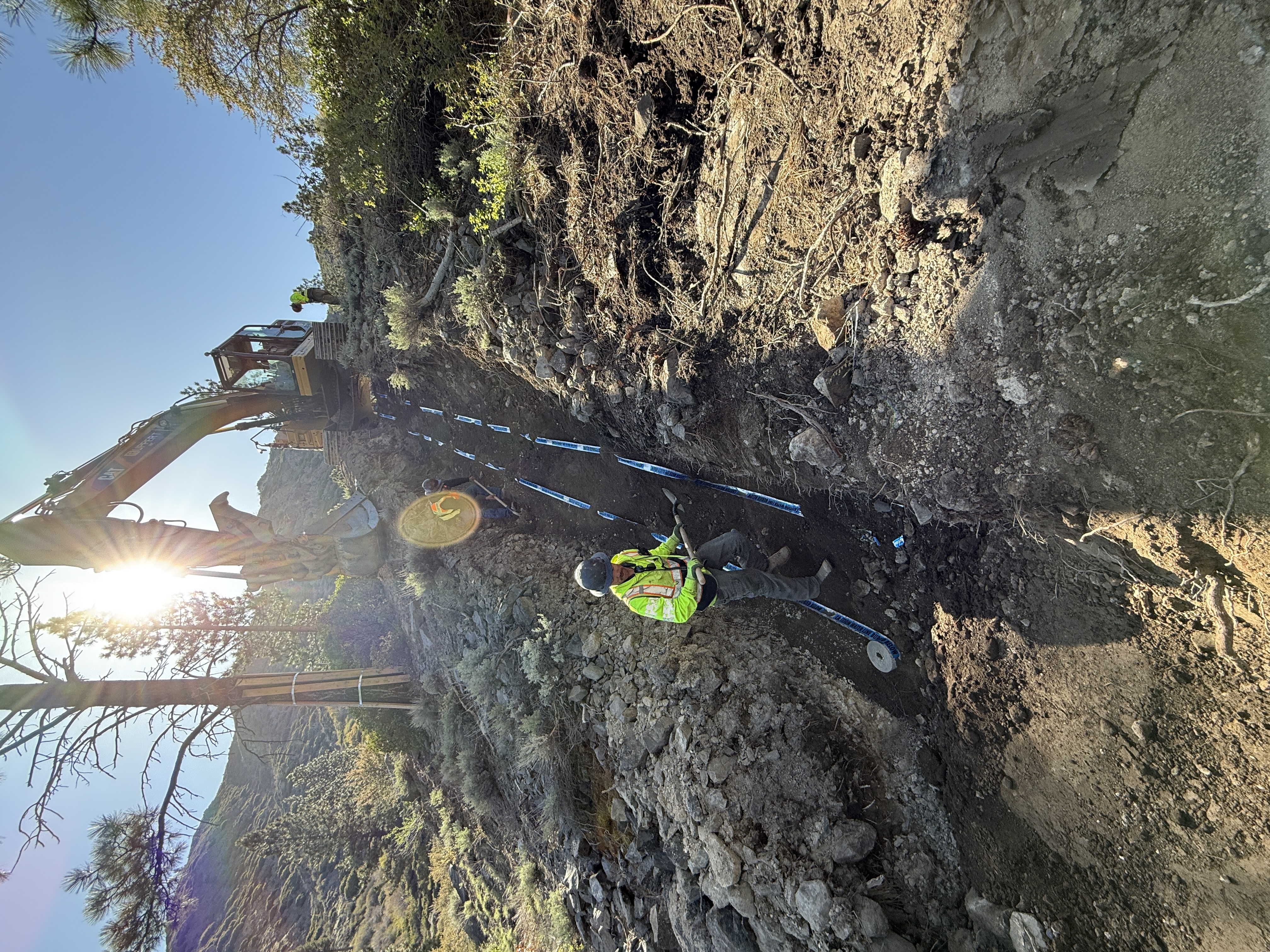 The image shows a trench being prepared with an excavator on a hillside. A worker in a hi-vis vest and hard hat is in the trench using a shovel. The trench has blue marking tapes laid along its length. The background includes rocky and vegetated slopes, indicating a natural environment.