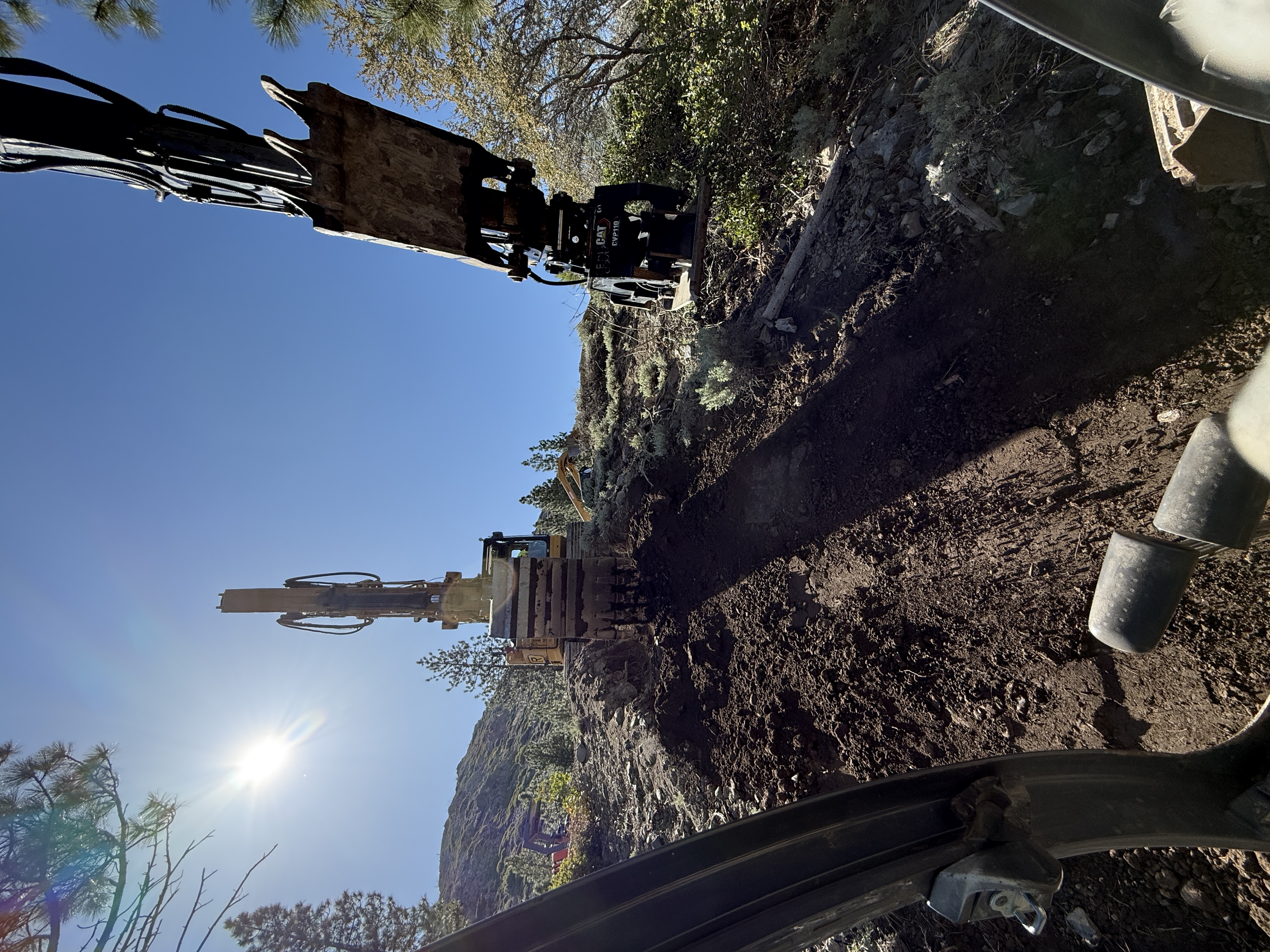 The image shows two excavators working on a sloped terrain under clear sunlight. One excavator is positioned at the top of a dirt incline, while the arm of the second excavator is visible from the lower position. The surrounding area includes natural vegetation and rugged terrain. The specific task or intent of excavation cannot be fully determined from the image.