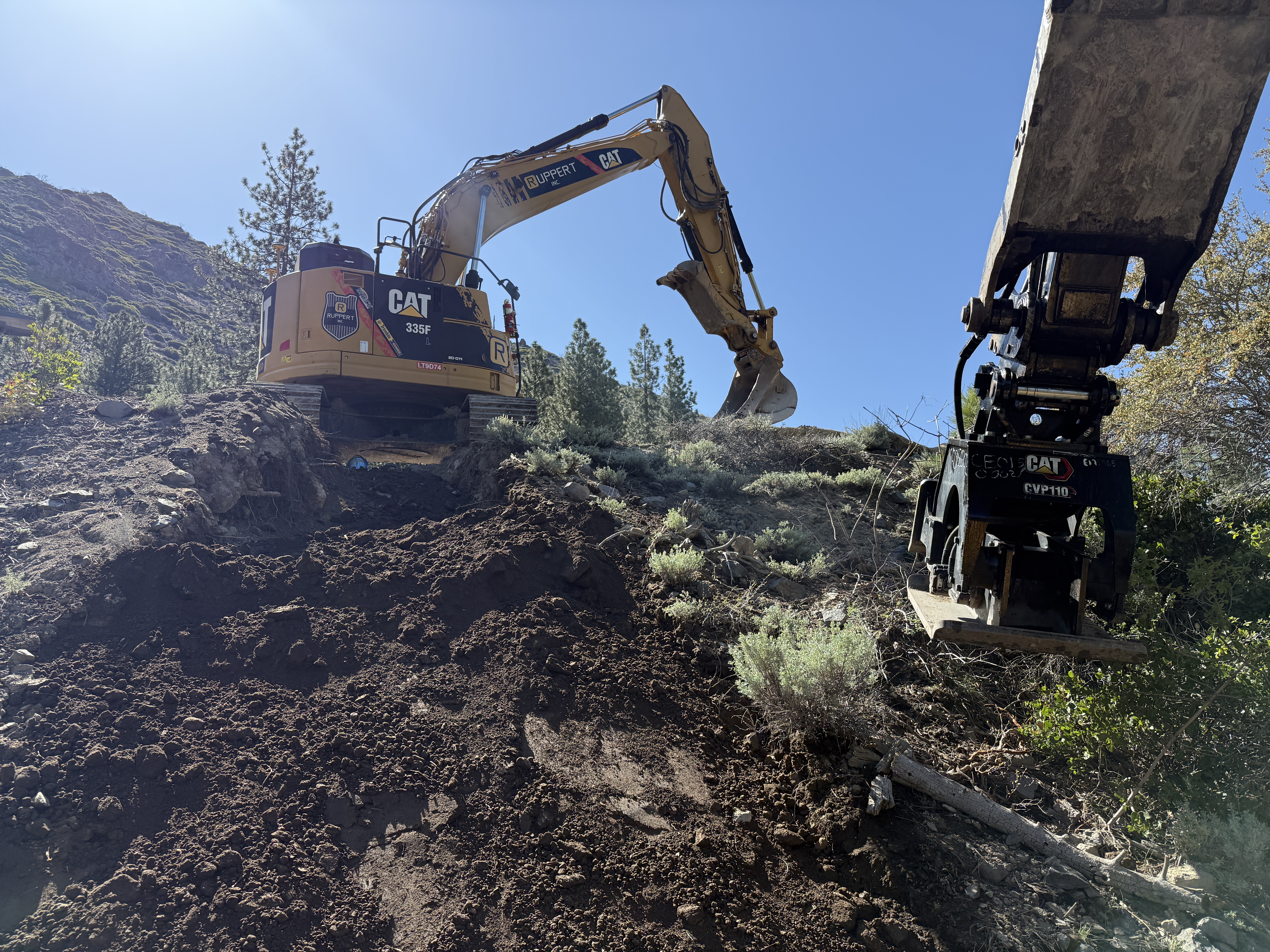 The image depicts an excavator on a dirt slope, actively moving soil. A second piece of heavy machinery is visible, possibly assisting in the operation. The area is surrounded by natural vegetation, with dirt and rocks being disturbed. The equipment appears to be in a wooded environment on a sunny day.