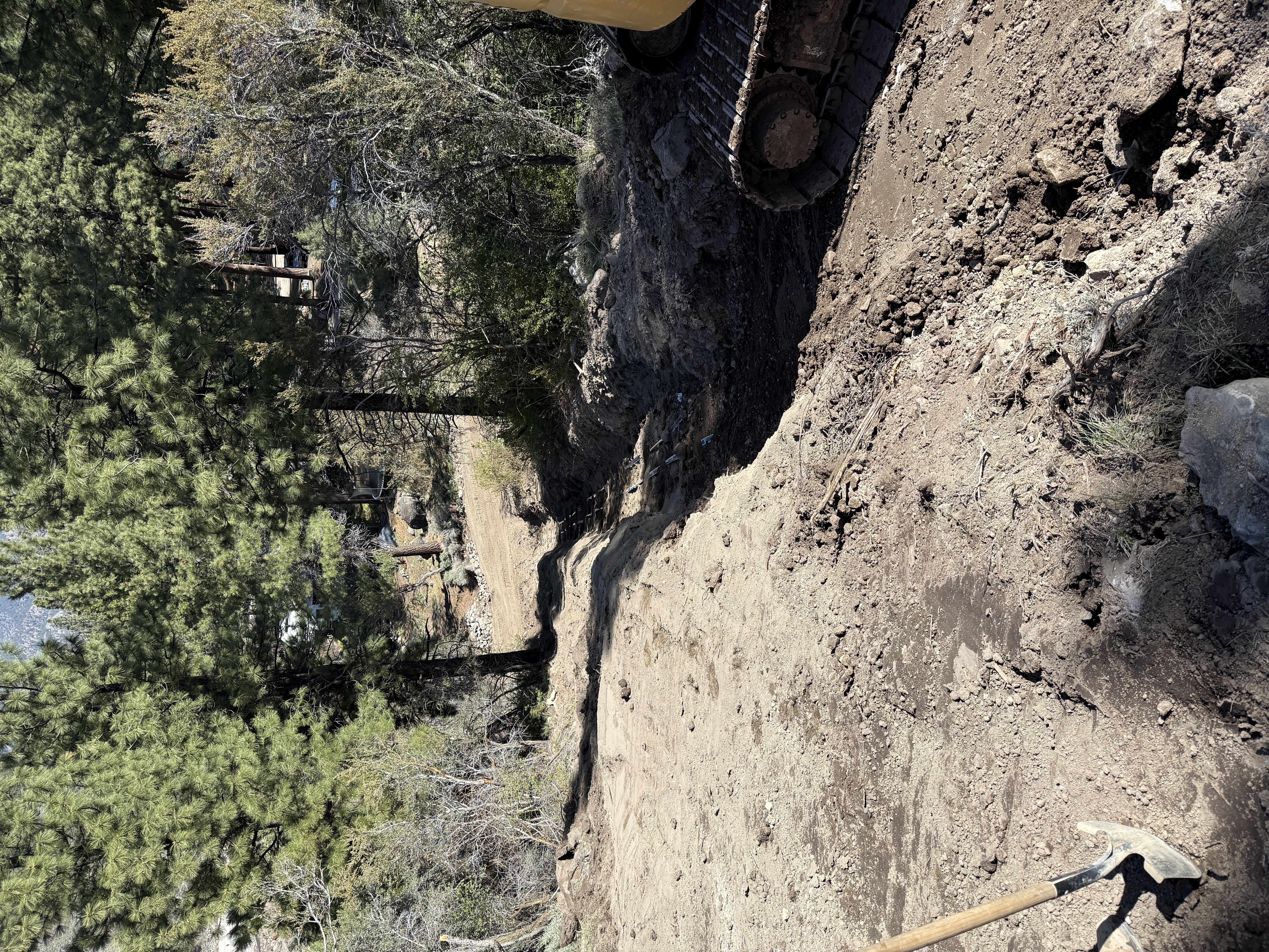 This image depicts excavation activities on a dirt path in a forested area. A tracked excavator is partially visible on the right side of the image. The left side shows part of a hand tool, likely a hoe, leaning against the ground. The foreground contains loose soil and uneven terrain, extending down the slope towards trees. No other materials or components are present.
