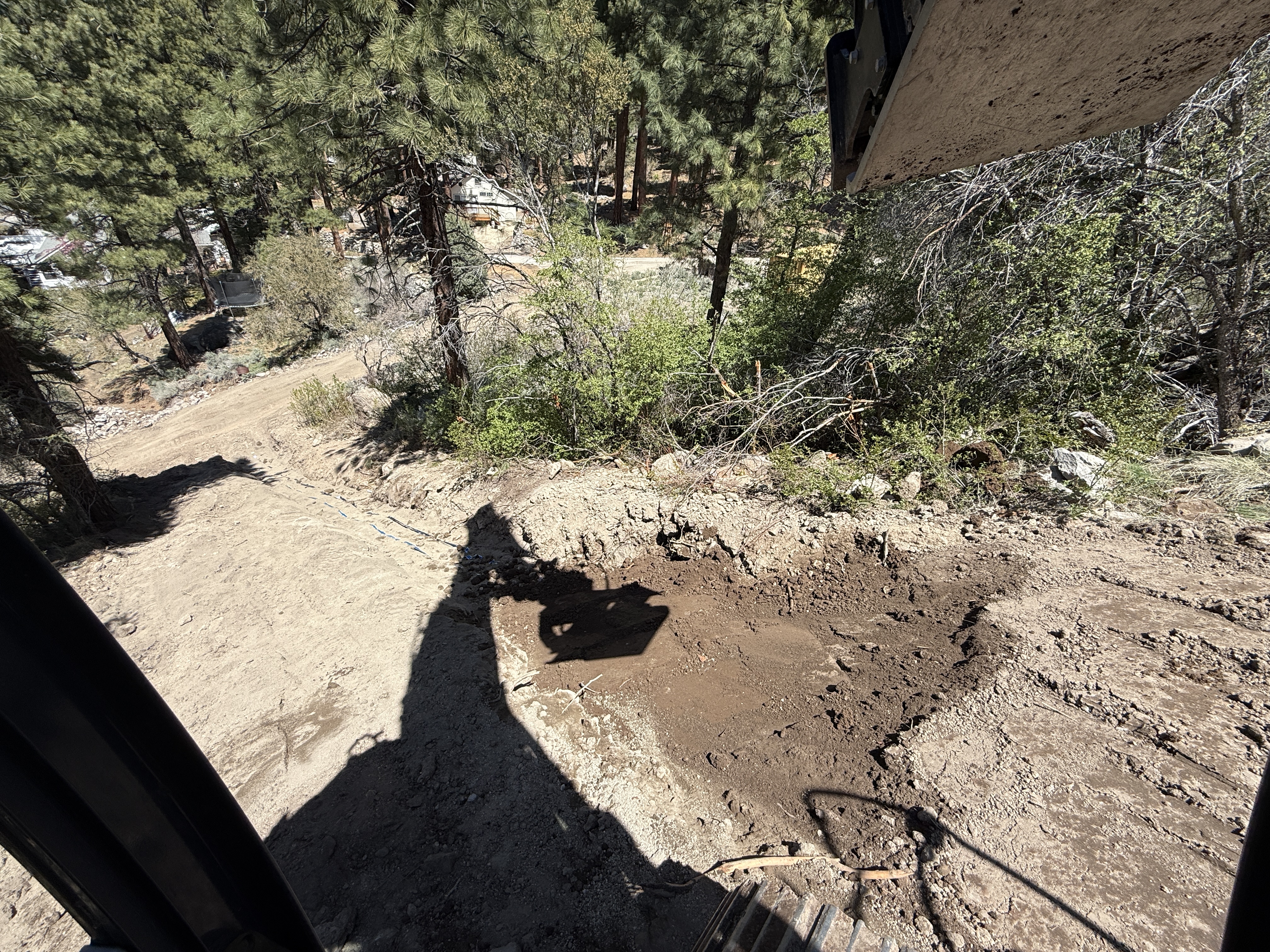 The image shows an excavation site with a dirt path on a sloped wooded area. There is visible soil disruption, suggesting earthwork using a piece of heavy machinery. Shadows indicate an active equipment presence, likely an excavator. There are no people or safety features visible in the frame.