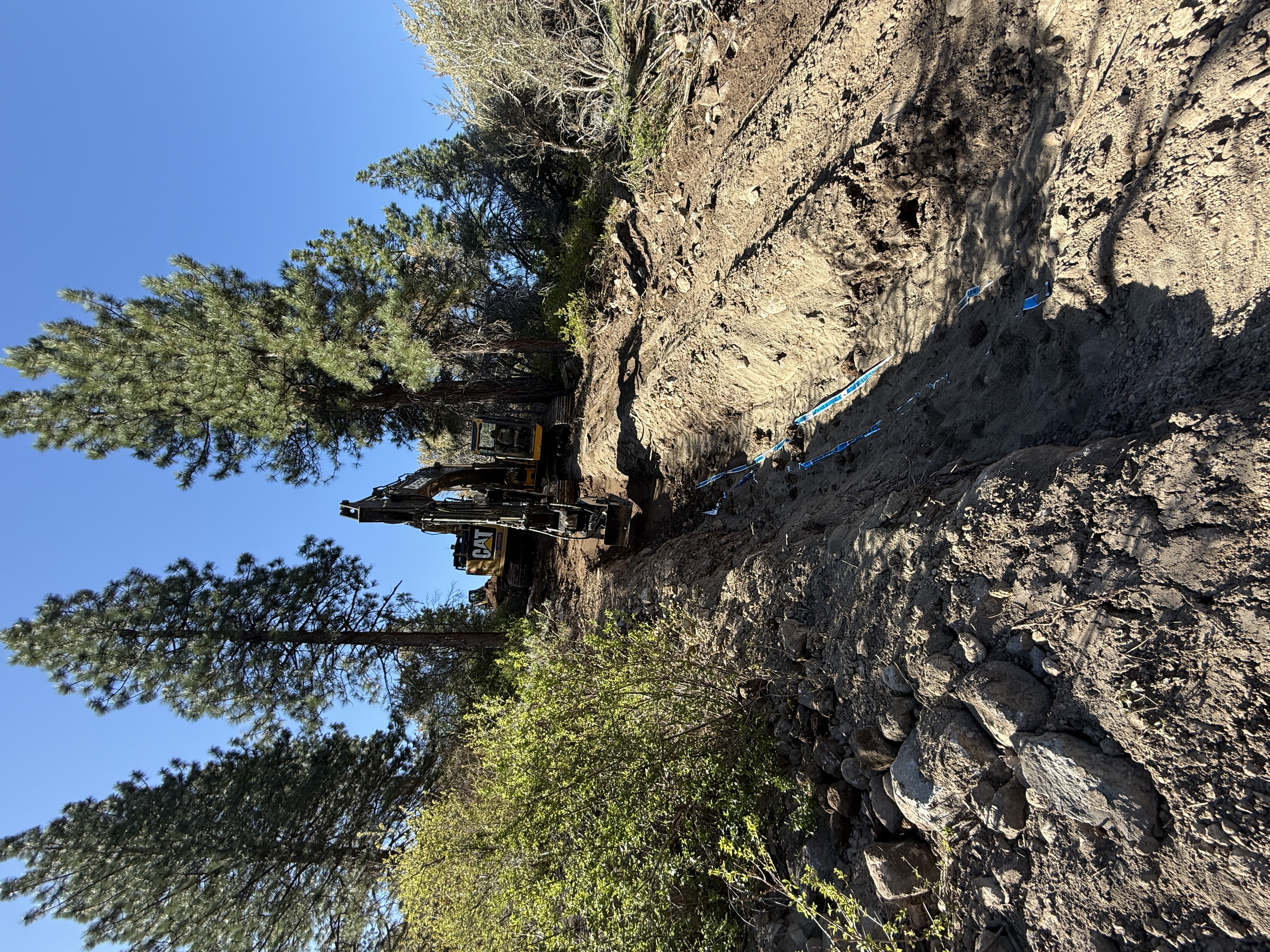 An excavator is positioned on a sloped area near trees, engaging in trenching work. A trench runs down the slope with blue piping material visible inside. The terrain appears uneven due to excavation activity. The workzone is within a wooded area with no visible traffic or pedestrian controls.