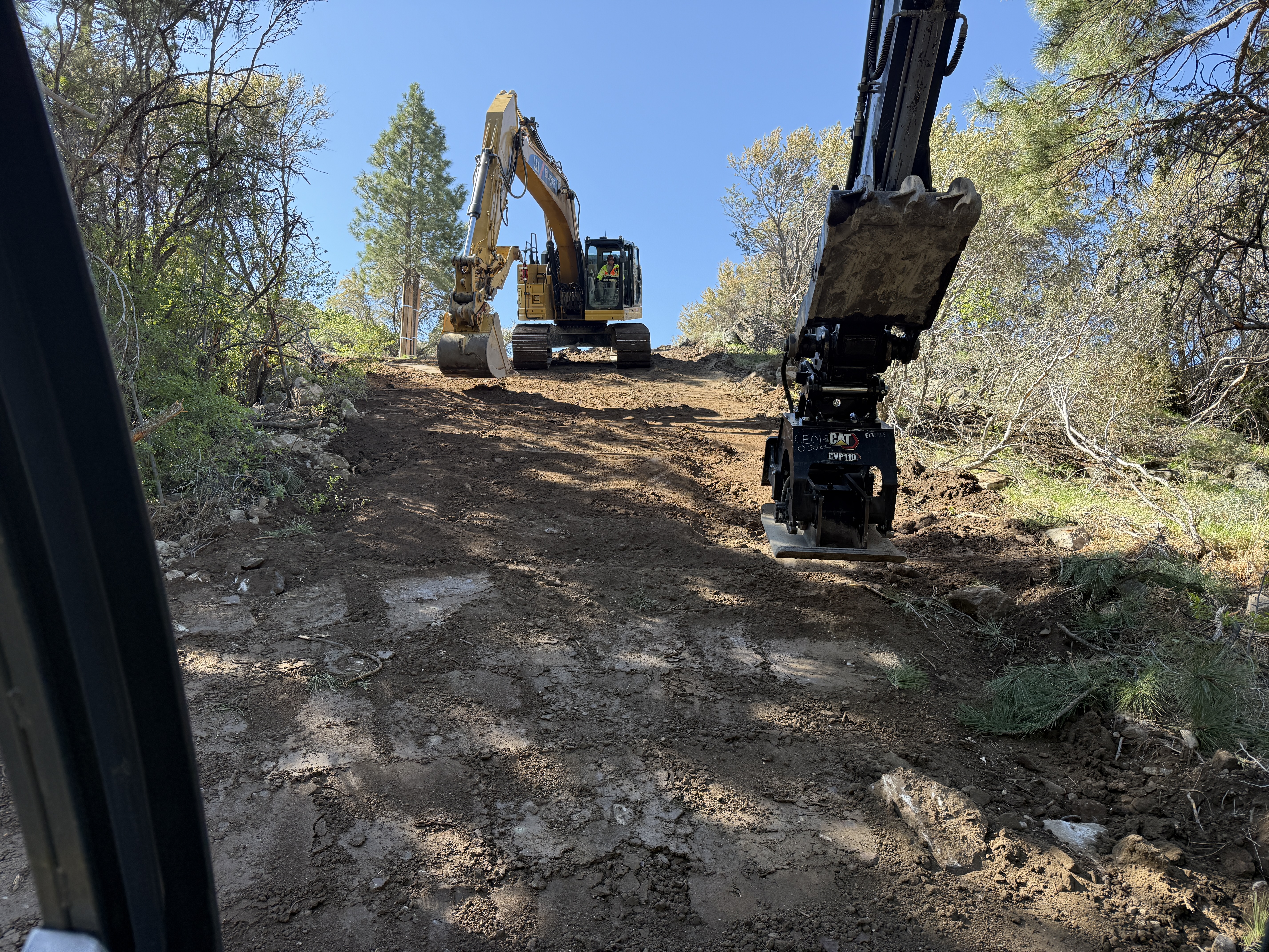 The image shows a sloped terrain with two excavators engaged in earthmoving activity. One excavator is positioned higher up the slope, while the other is positioned lower with a visible attachment. Vegetation and trees surround the work area, indicating that the work is taking place in a forested region. The equipment appears to be actively engaged in site excavation or grading.