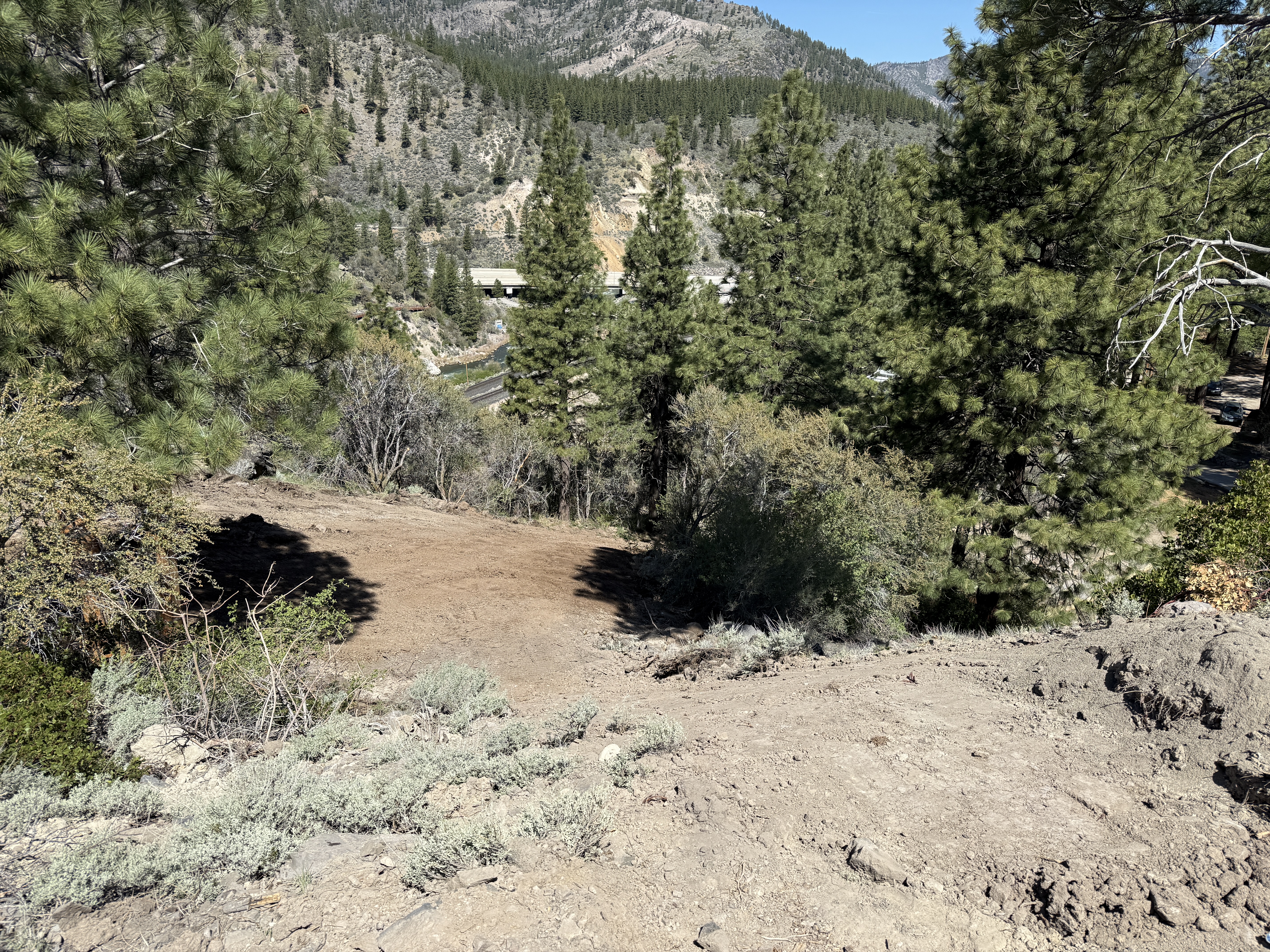 The image shows an area of bare soil with a slight slope in a forested region. Pine trees surround the area, and there appears to be a bridge in the background spanning a valley. The bare soil suggests recent clearing or grading activity. There is no construction equipment, materials, or active work visible.