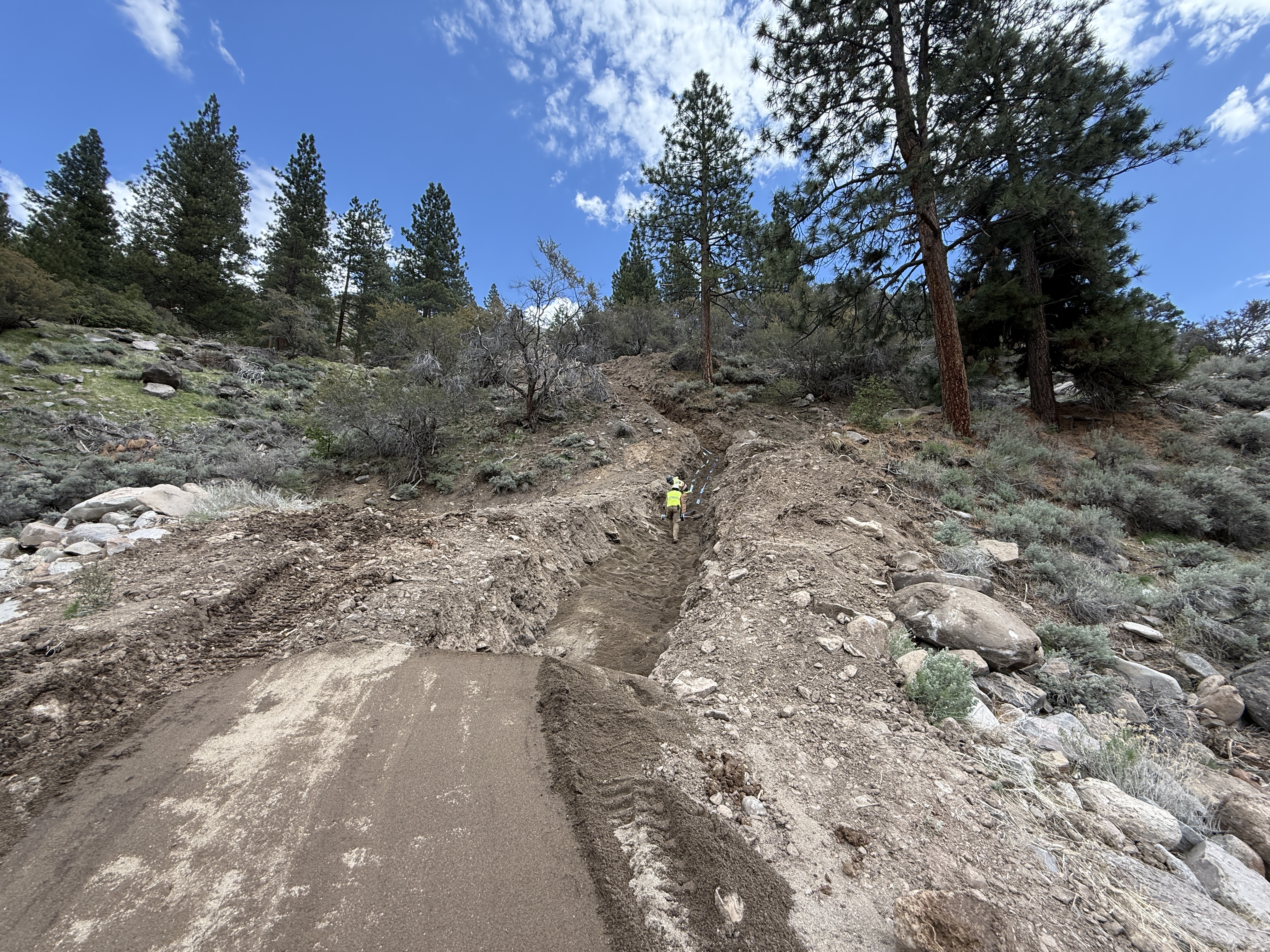 A worker in a hi-vis vest is standing amidst an open trench running up a slope. The surrounding area is filled with trees and rocky terrain, suggesting a natural, possibly remote setting. The trench appears to be recently excavated, with soil and debris evident along the sides. There are no visible heavy machinery or specialized construction equipment in the frame.