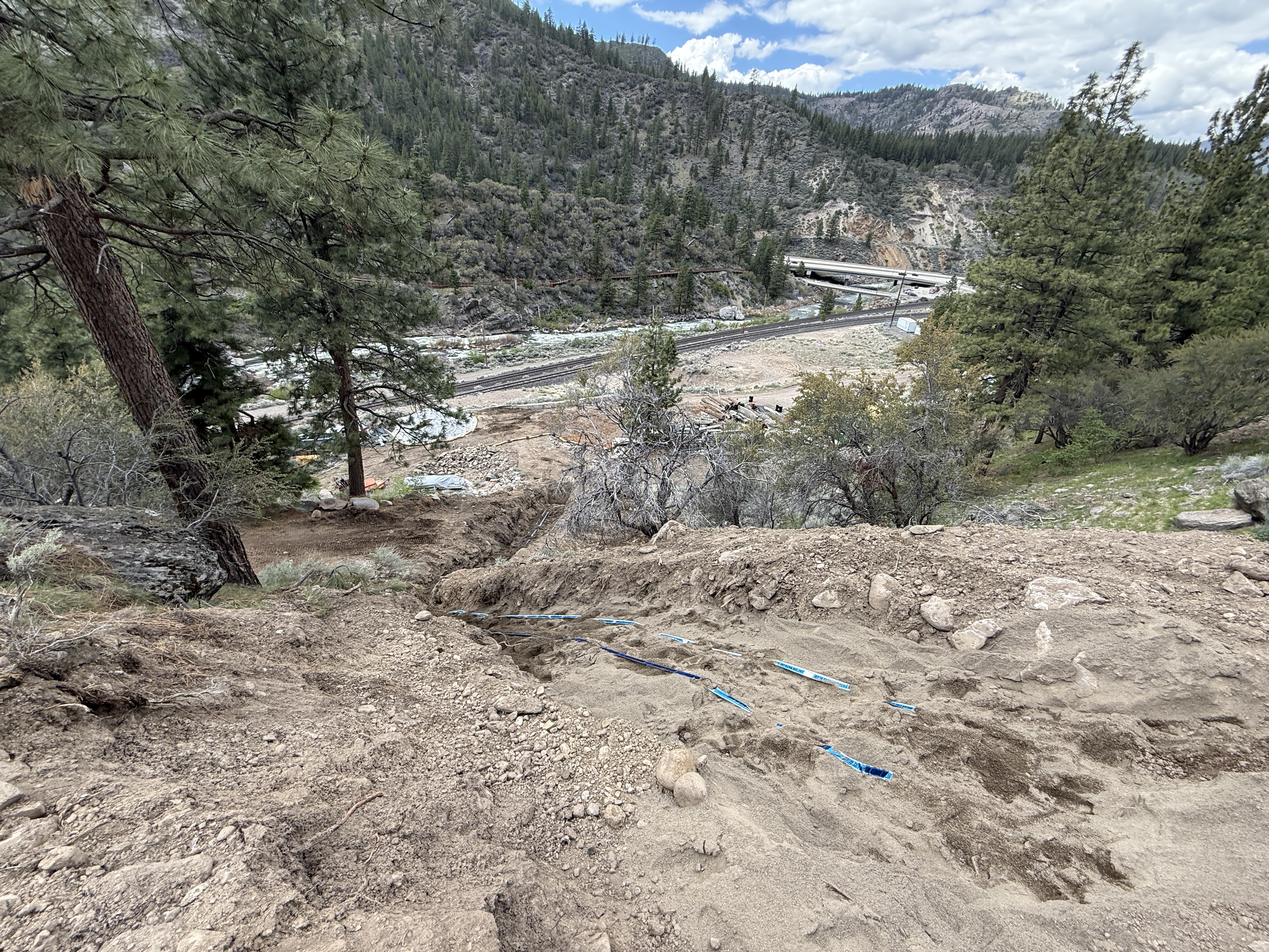 The image shows a trench descending a slope with several blue pipes partially buried in the soil. The surrounding area consists of rocky ground and trees, with a bridge and roadway visible in the background. The trench appears to be freshly dug, with loose soil around the edges. Some construction materials are visible in the distance near the highway.
