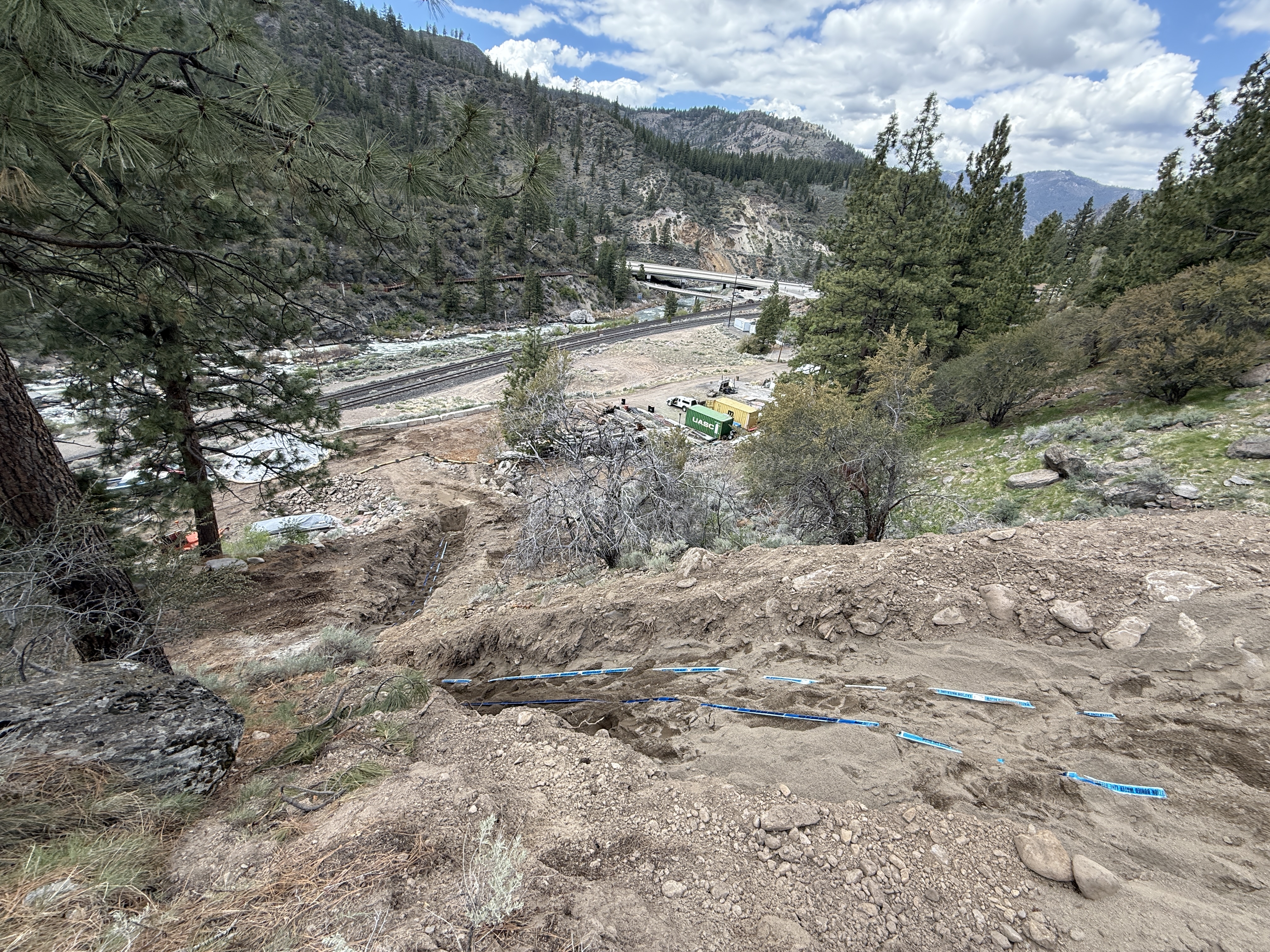 soil and rocky terrain with trench partly cloudy daylight vehicles and materials staged at lower elevation