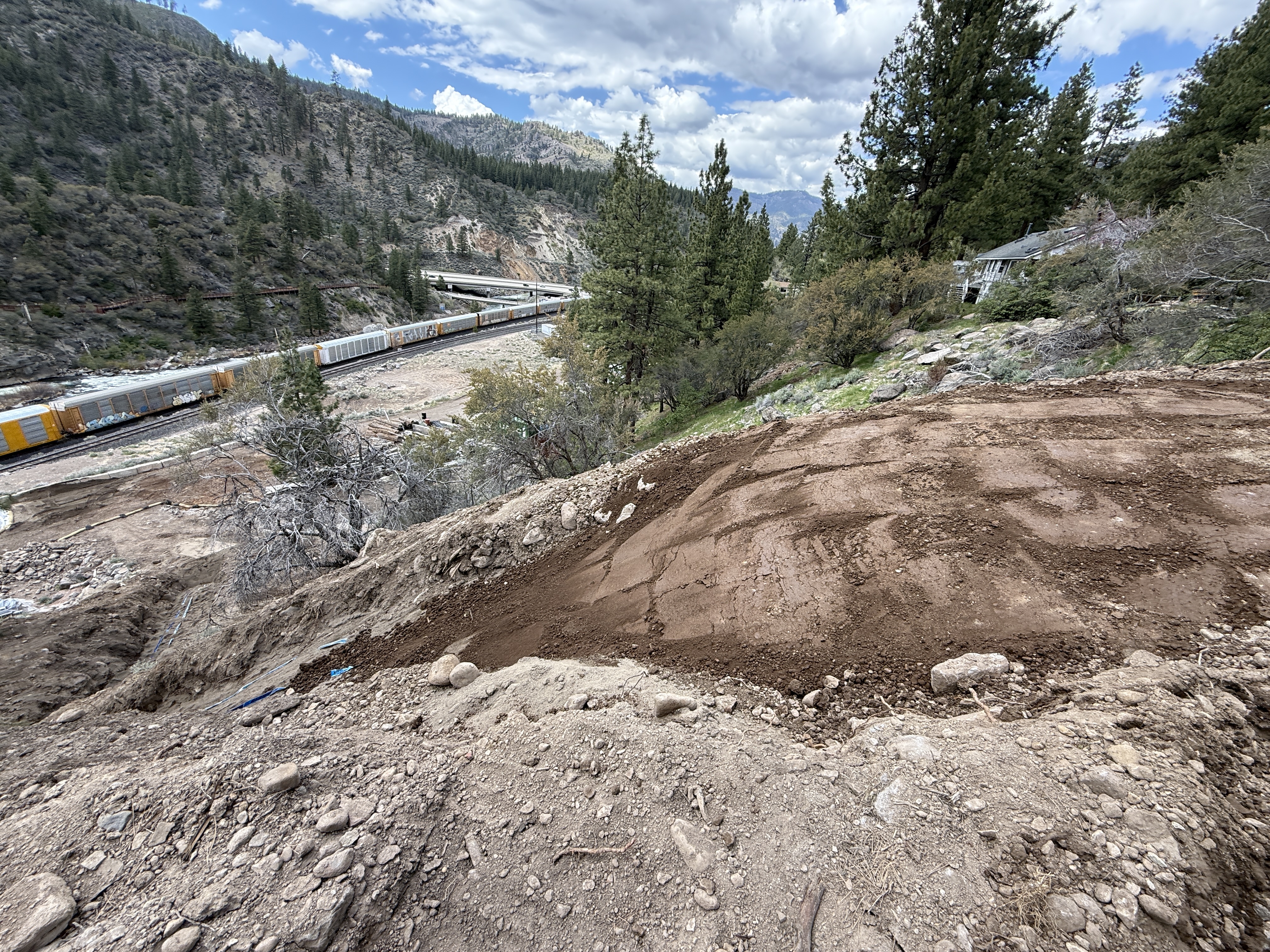 In this image, the foreground shows a cleared and graded soil area. The background includes a set of train tracks with a freight train visible. Surrounding the site are trees and rocky terrain typical of a mountainous region. The cleared area suggests preparation for construction, although specific construction activities are not visibly underway.