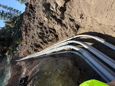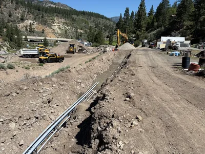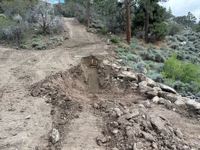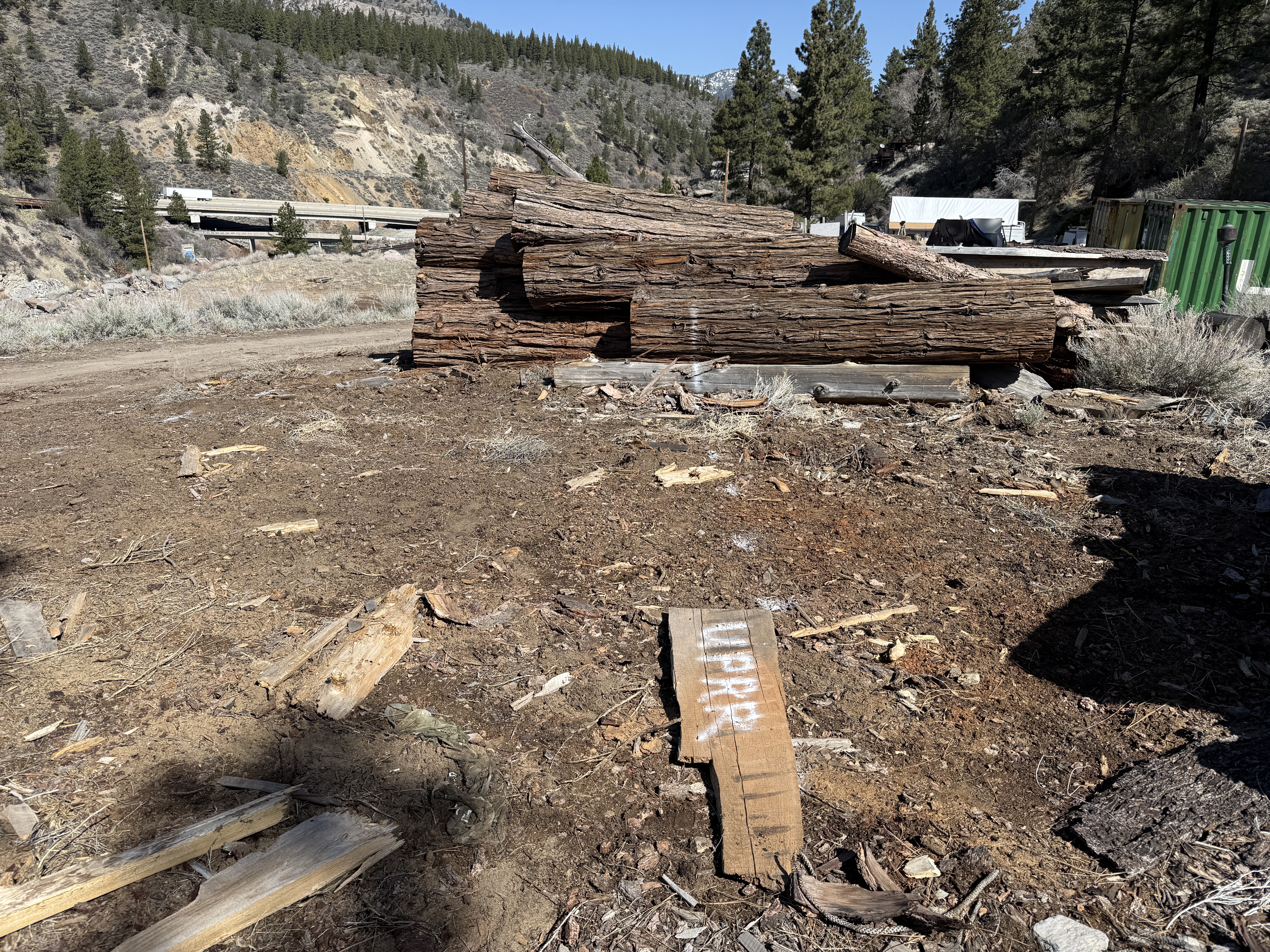 The image displays a pile of stacked wooden logs and beams on a dirt ground. Various debris and smaller wood pieces are scattered around the pile. In the background, a bridge and evergreen trees can be seen. There is a piece of wood marked with 'UPRR' lying on the ground in front of the log pile.