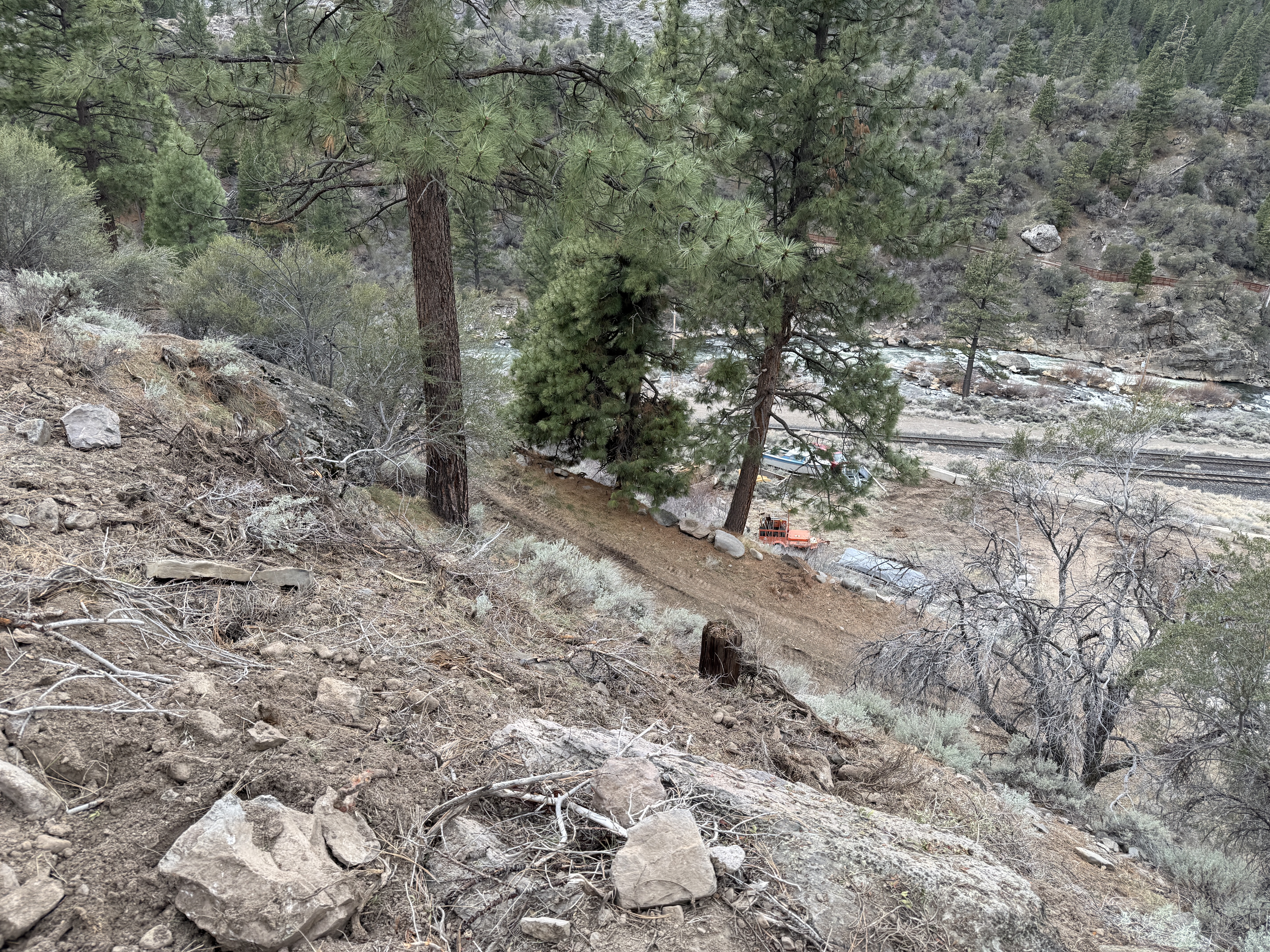 dirt and rocky slope overcast lighting equipment and materials staged near trees and water