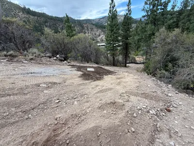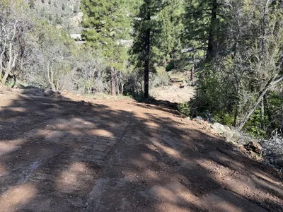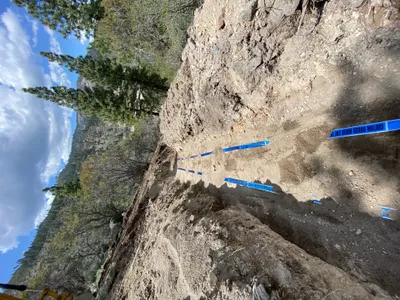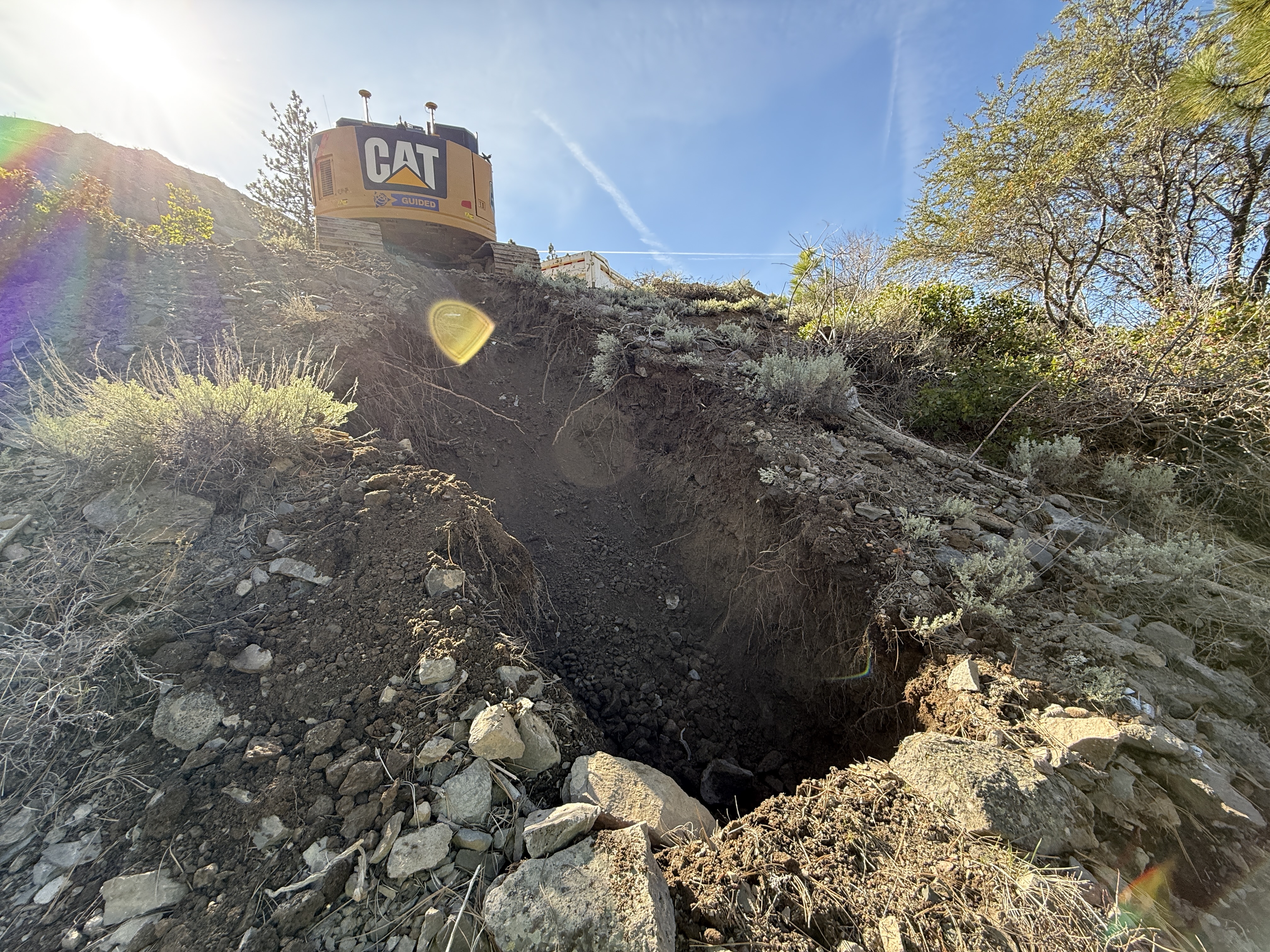 An open area of disturbed earth is visible on a slope, indicating excavation activity. A tracked excavator is positioned at the top of the slope, suggesting recent or ongoing earthmoving work. The site features rocks, vegetation, and exposed soil. The weather appears clear and sunny.