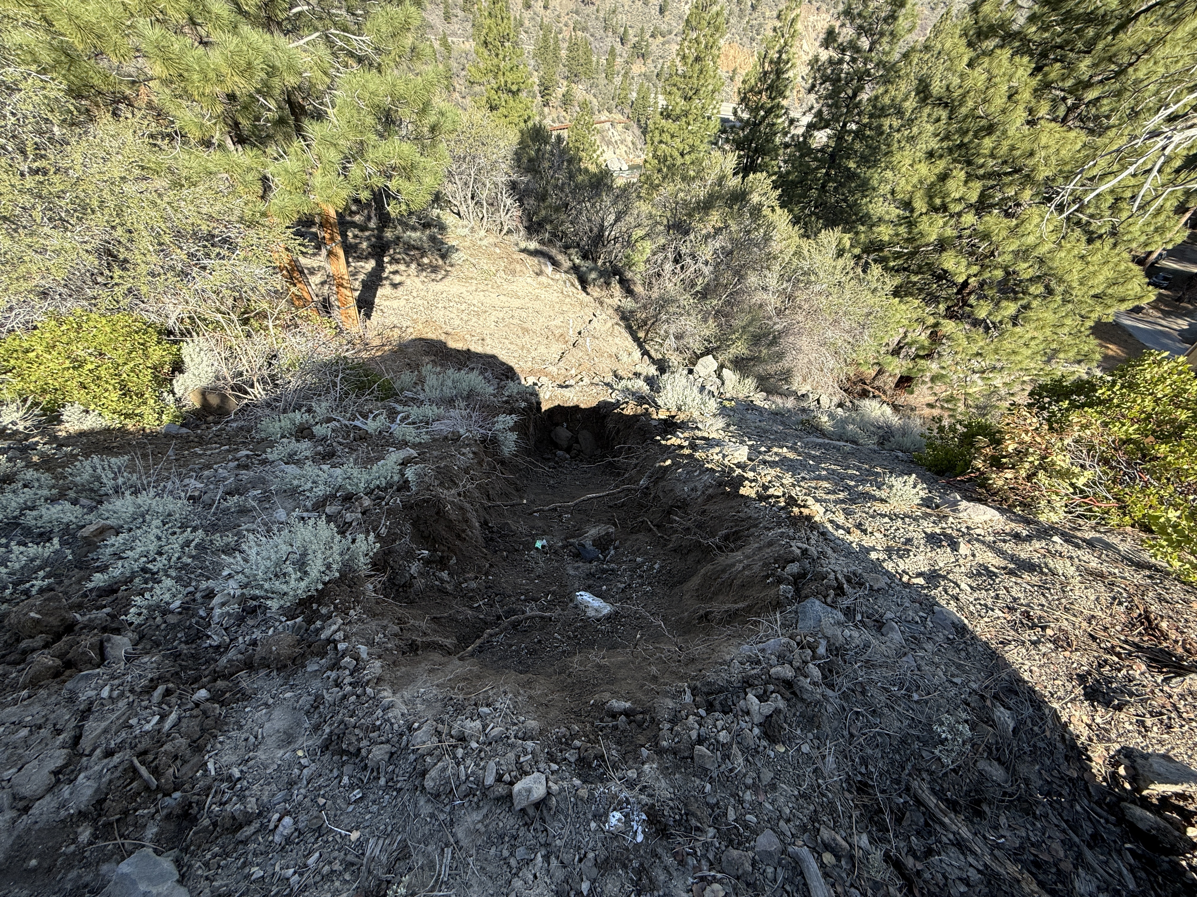 The image shows a dug-out or eroded section of soil on a hillside with surrounding vegetation. No machinery, tools, or active work crew are visible in the image. The disturbed area appears to be approximately in the center of the frame, leading down the slope. There are remnants of vegetation around the perimeter, indicating recent soil movement or removal.