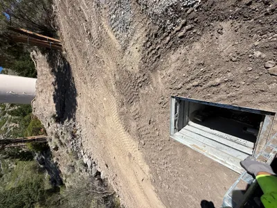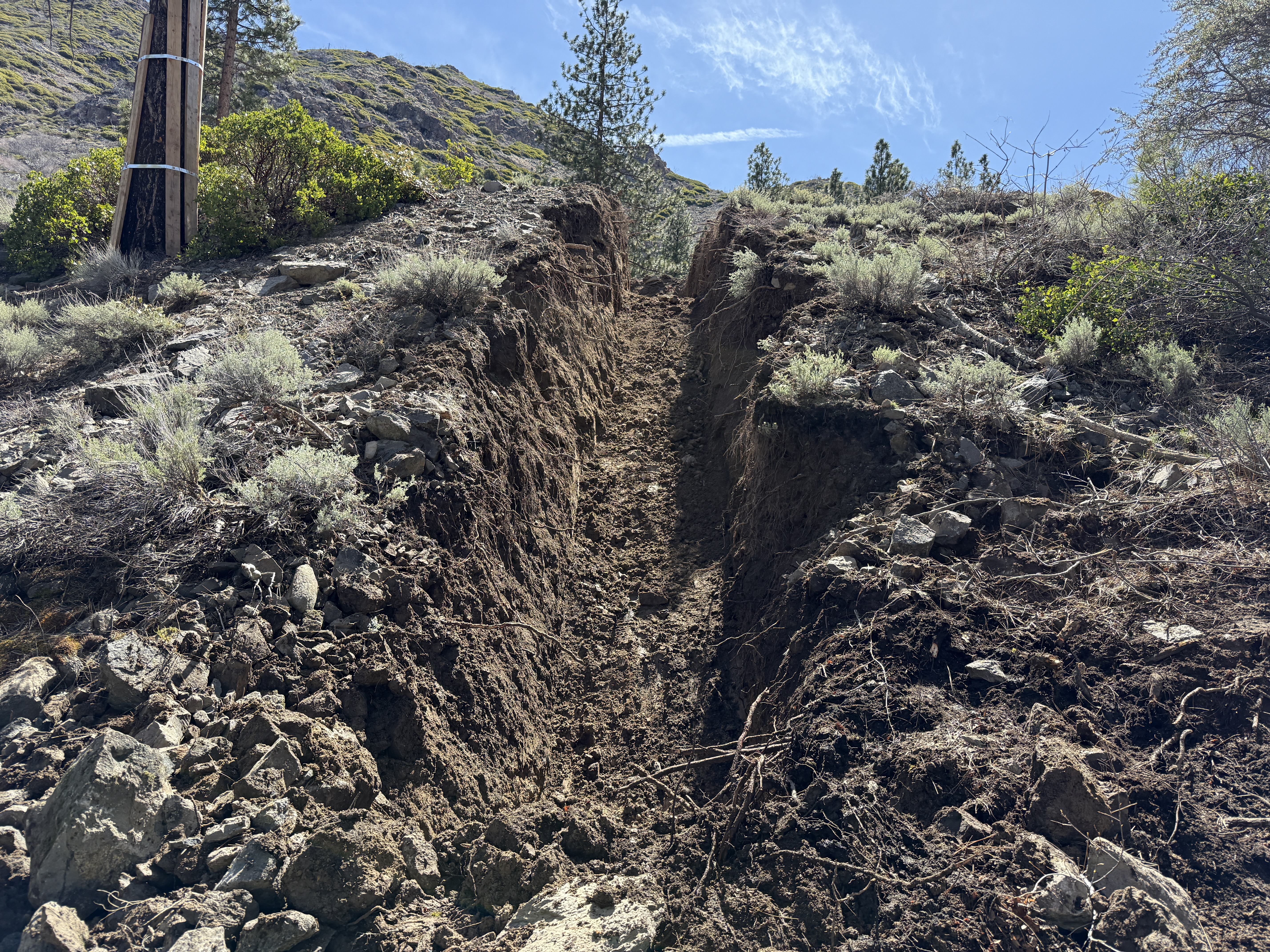 A trench is visibly excavated on a slope, cutting through rocky soil and sparse vegetation. There's no visible equipment or personnel in the frame. It appears to be an unguarded trench with uneven ground conditions. The weather is clear, with sunlight casting shadows along the trench walls.