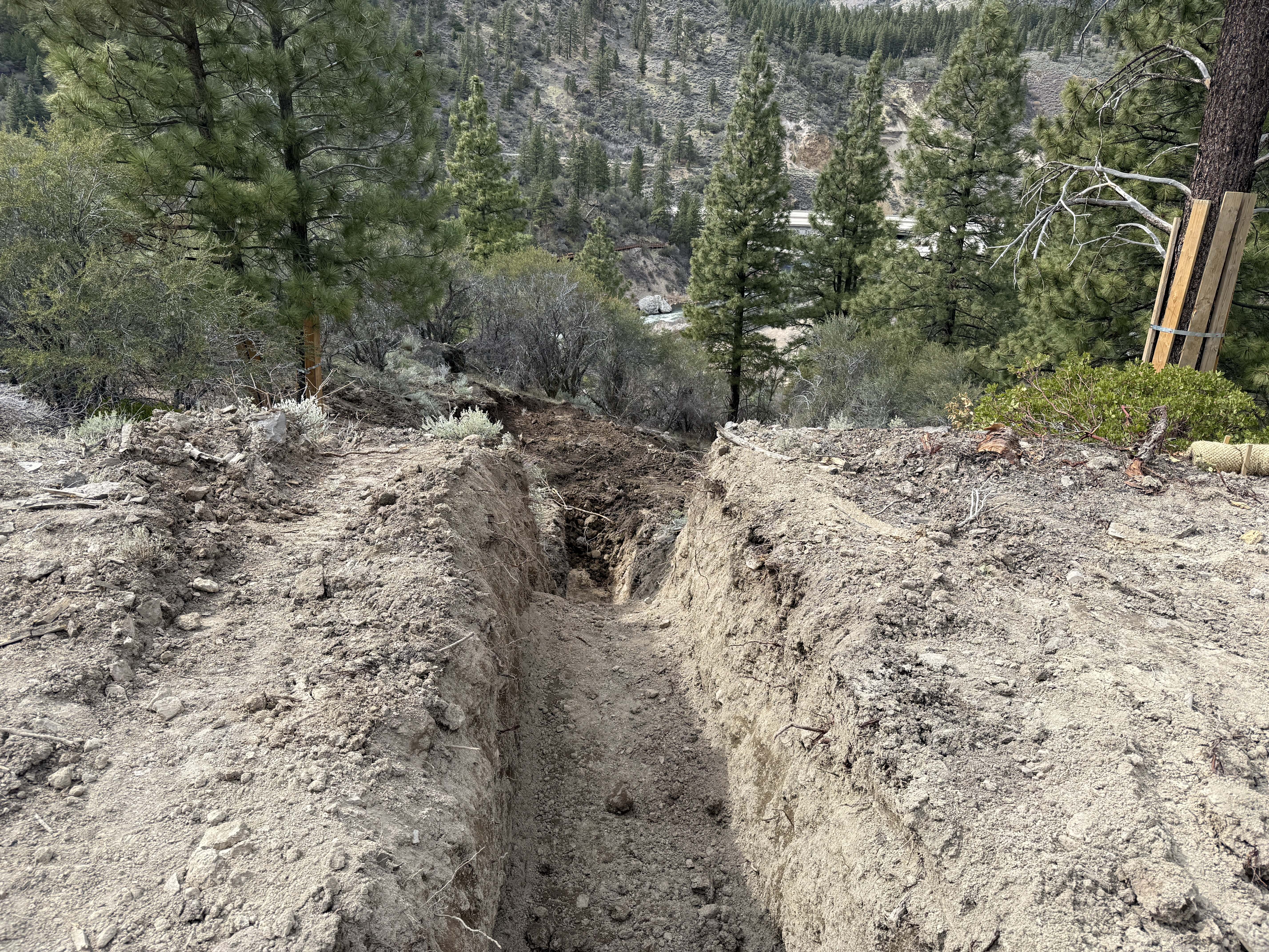 The image displays an excavated trench in a sloped area within a forested region. The trench is unshored and surrounded by dirt and some vegetation. There are pine trees and underbrush visible along the edges. The soil surface around the trench appears dry and slightly rocky.