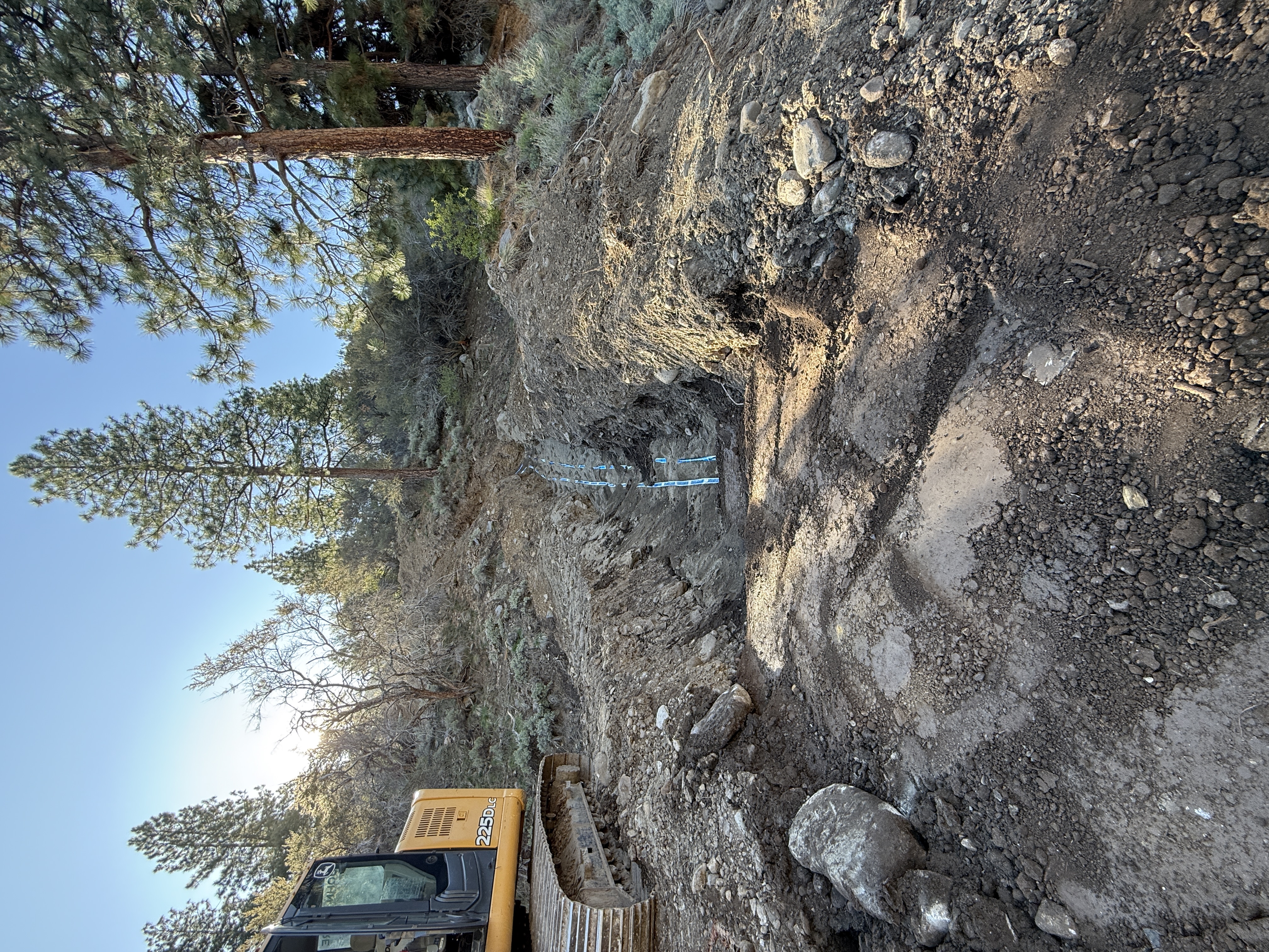 An excavated trench runs through a sloped terrain with visible exposed soil. Blue pipes are placed at the bottom of the trench. A heavy excavator is partially visible on the left, suggesting active or recent trench digging. The surrounding area includes trees and uneven ground conditions.