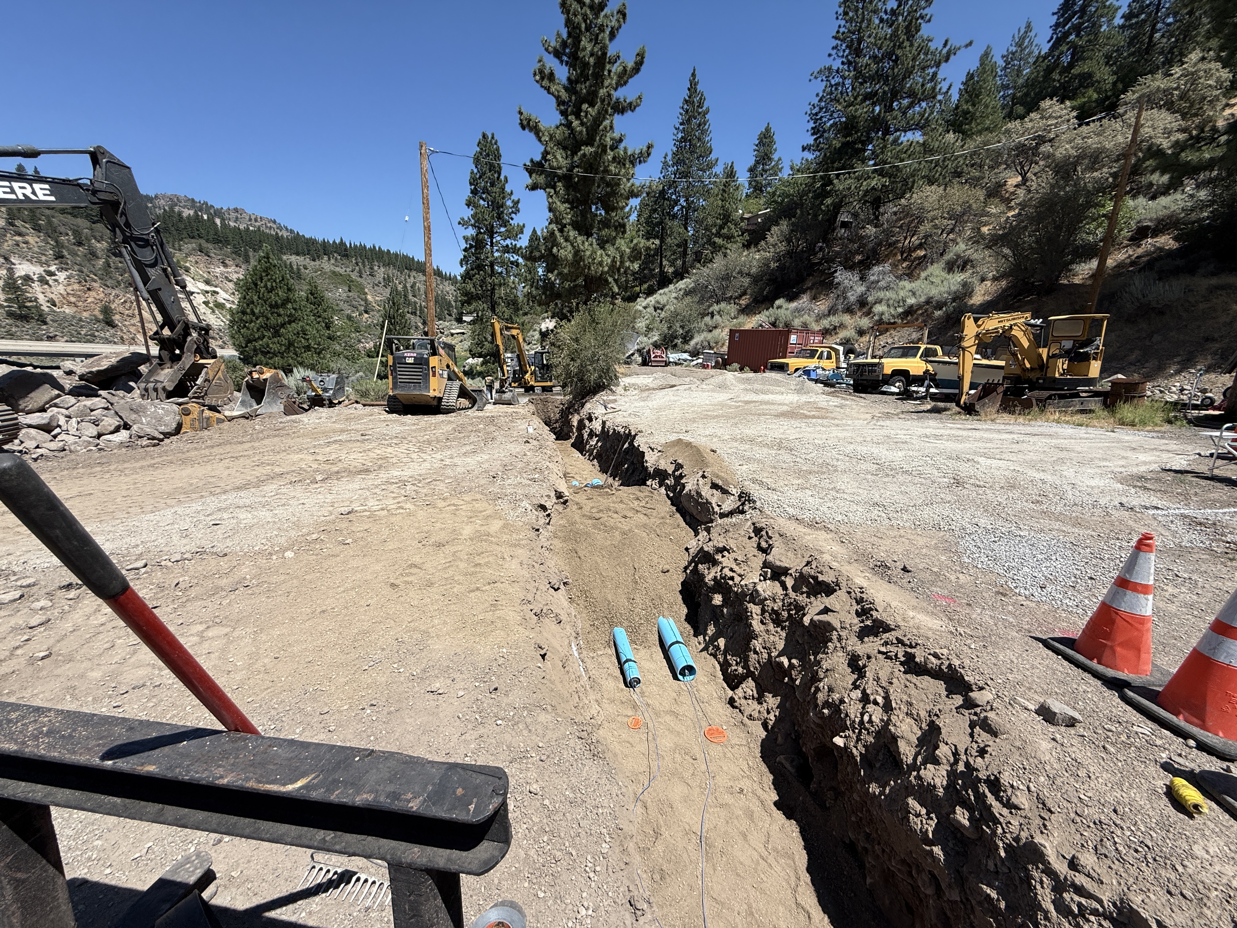 The image shows an open trench running through a construction site, with heavy equipment like excavators positioned along it. Two blue utility pipes are visible in the trench. Construction cones are set nearby indicating safety measures. The site appears to be in a rural environment with surrounding trees and hills. Additional vehicles and equipment are present in the background.
