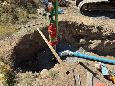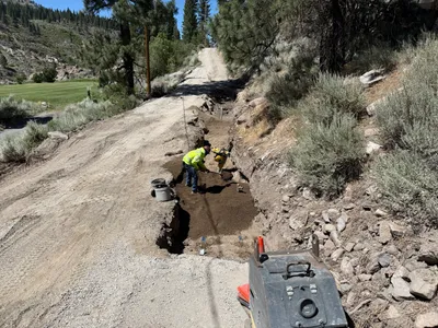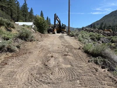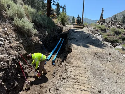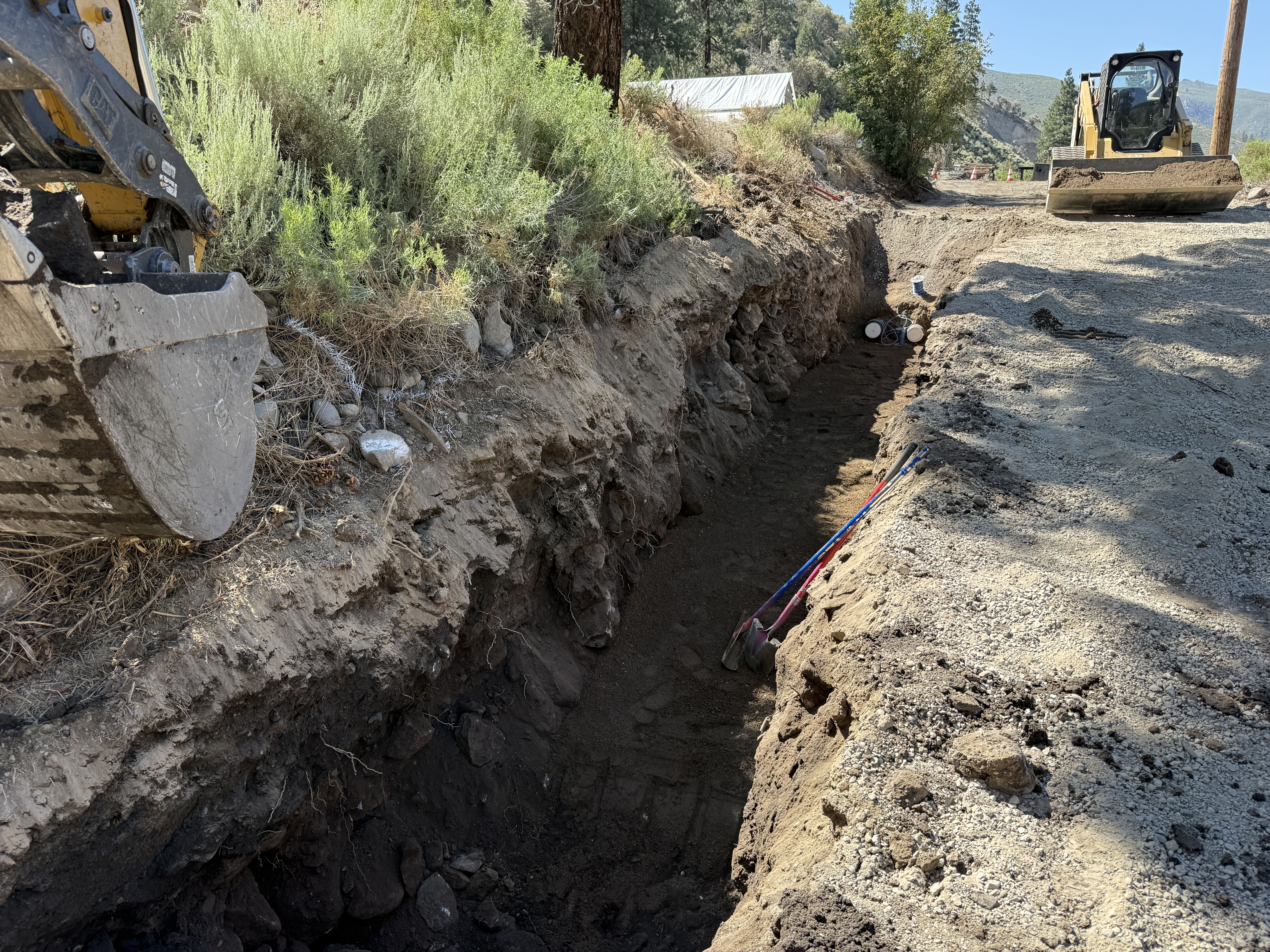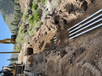 The image shows an active trenching operation with a trench dug alongside a dirt road. An excavator is positioned to the left, and a compact track loader is visible further down the road. Trenches contain pipes, possibly part of a utility installation. Multiple hand tools like shovels are visible near the trench edge.