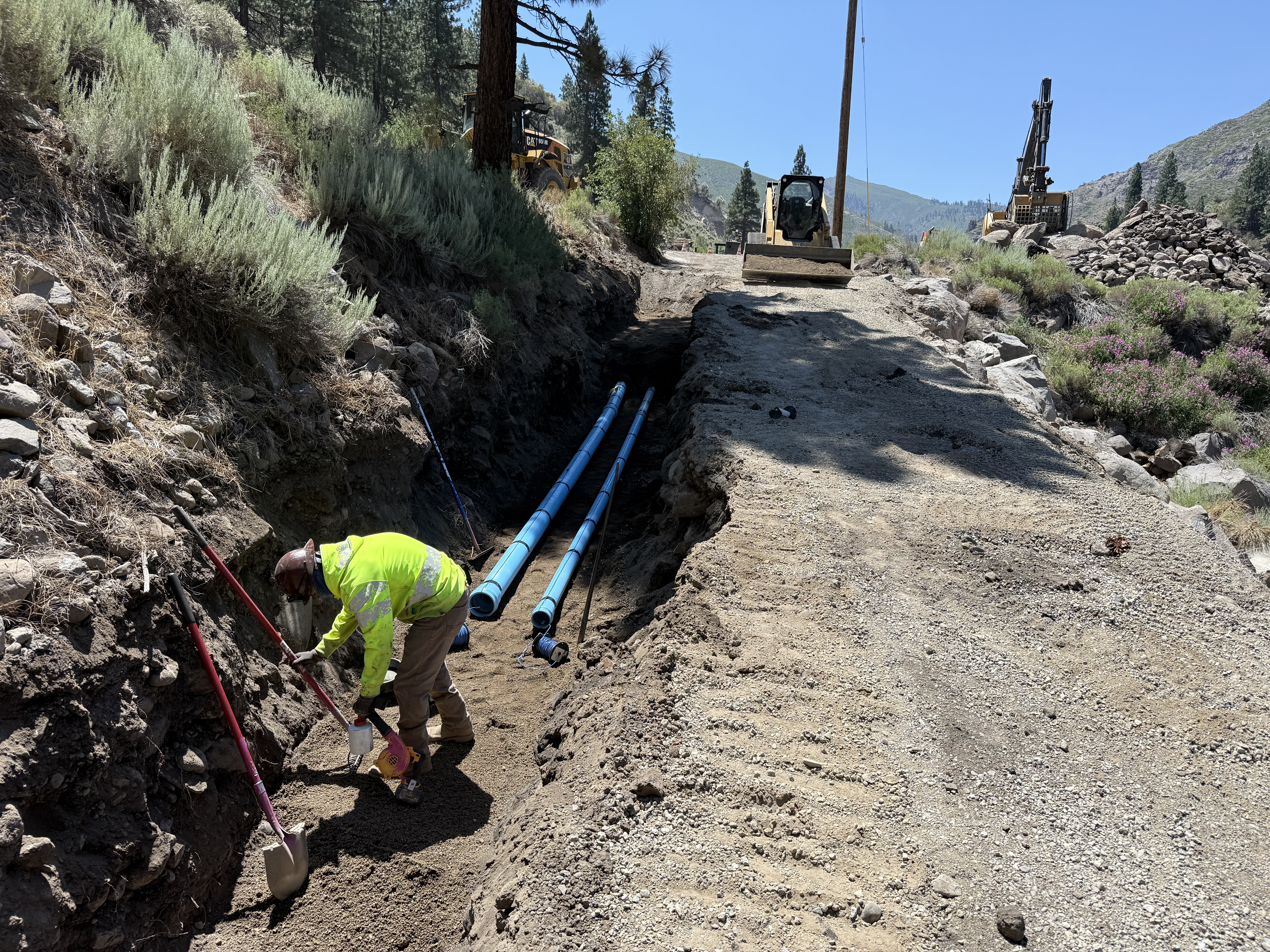 The image shows a worker compacting or smoothing soil within a trench, adjacent to several blue pipes. A bulldozer and an excavator are in the background, indicating ongoing site work. The individual is wearing a hard hat, hi-vis vest, and work boots, suggesting adherence to safety protocols. The surrounding area is rural with trees and rocky terrain showing an excavated trench.