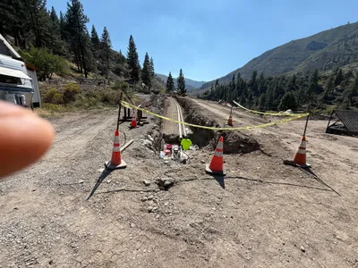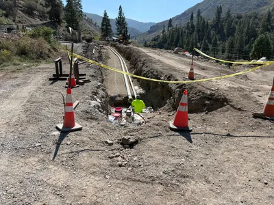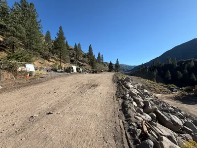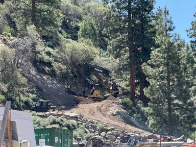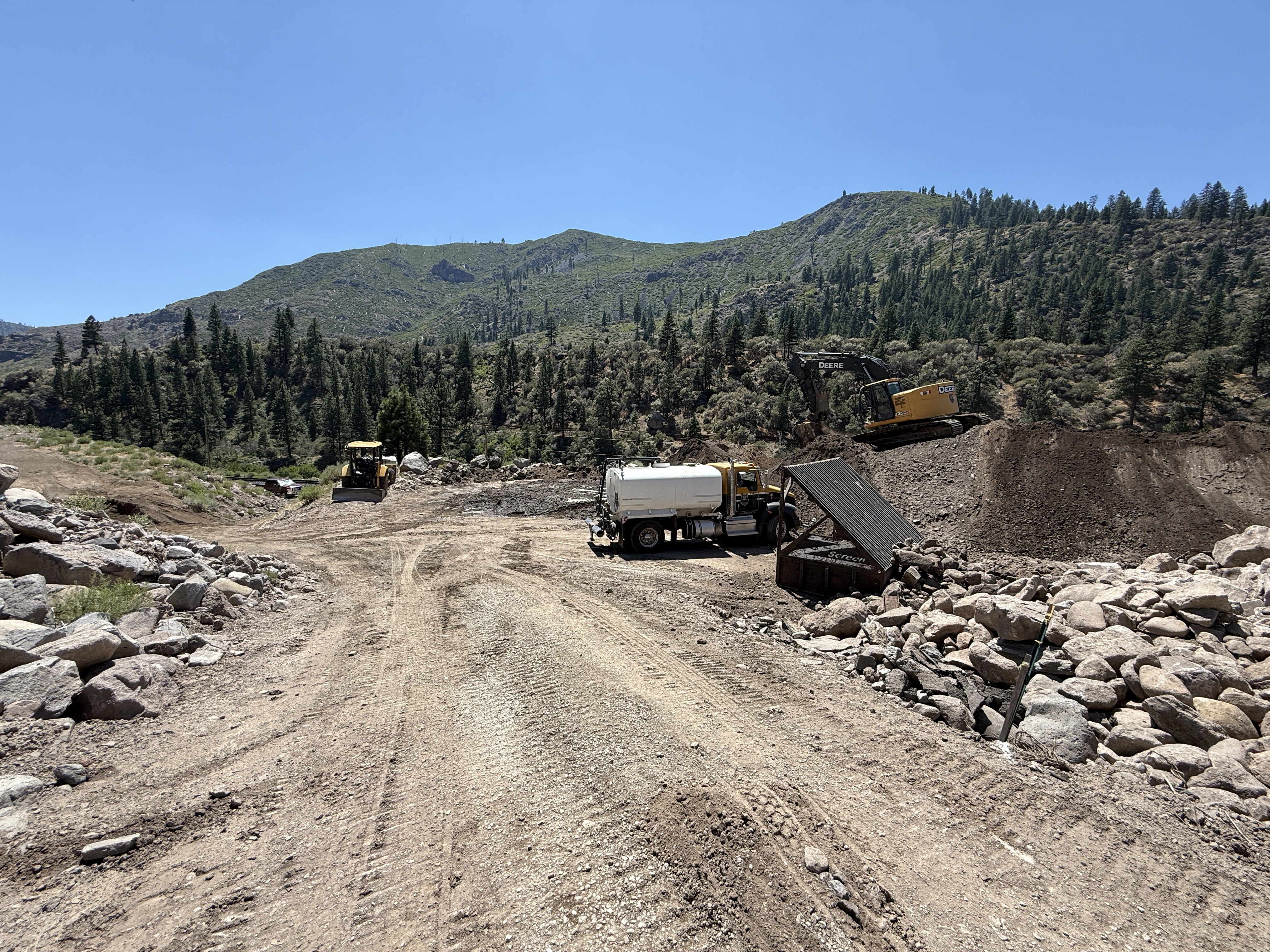 The image shows an active construction site with visible earthmoving equipment such as an excavator and a water truck. A bulldozer is also visible on site. The landscape includes rocky terrain with scattered rocks and soil. Two pieces of heavy machinery are positioned at the center and right, while the truck is near the center. There are no personnel visible, and no discernible safety features like barriers or cones.
