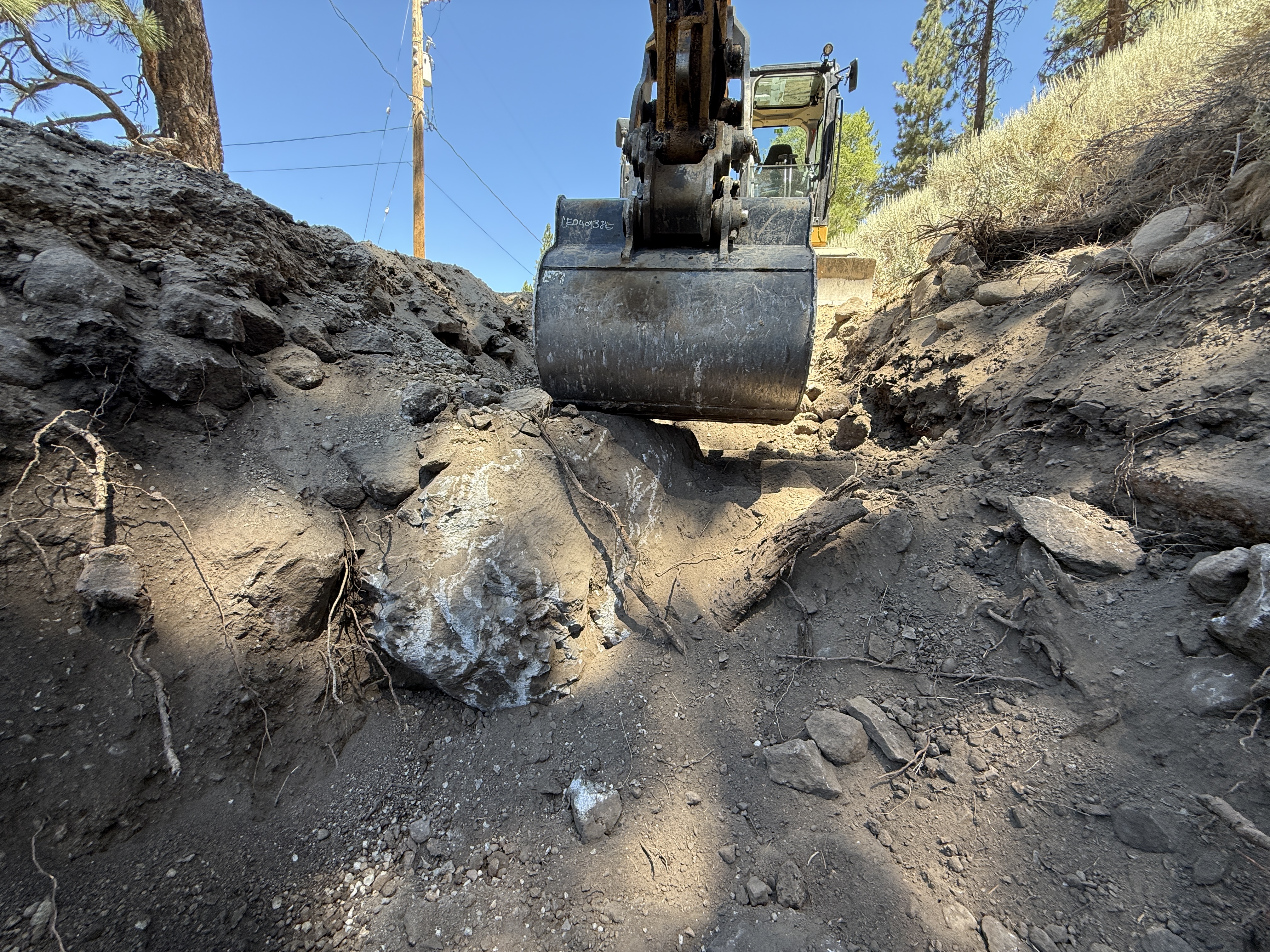 The image shows an excavator located in a trench with its bucket extending downward to manipulate a large rock. The surroundings consist of loose soil, rocky debris, and visible tree roots. The trench lines an area with a visible power pole in the background, indicating proximity to utilities. No other construction activity or crew members are visible in the image.