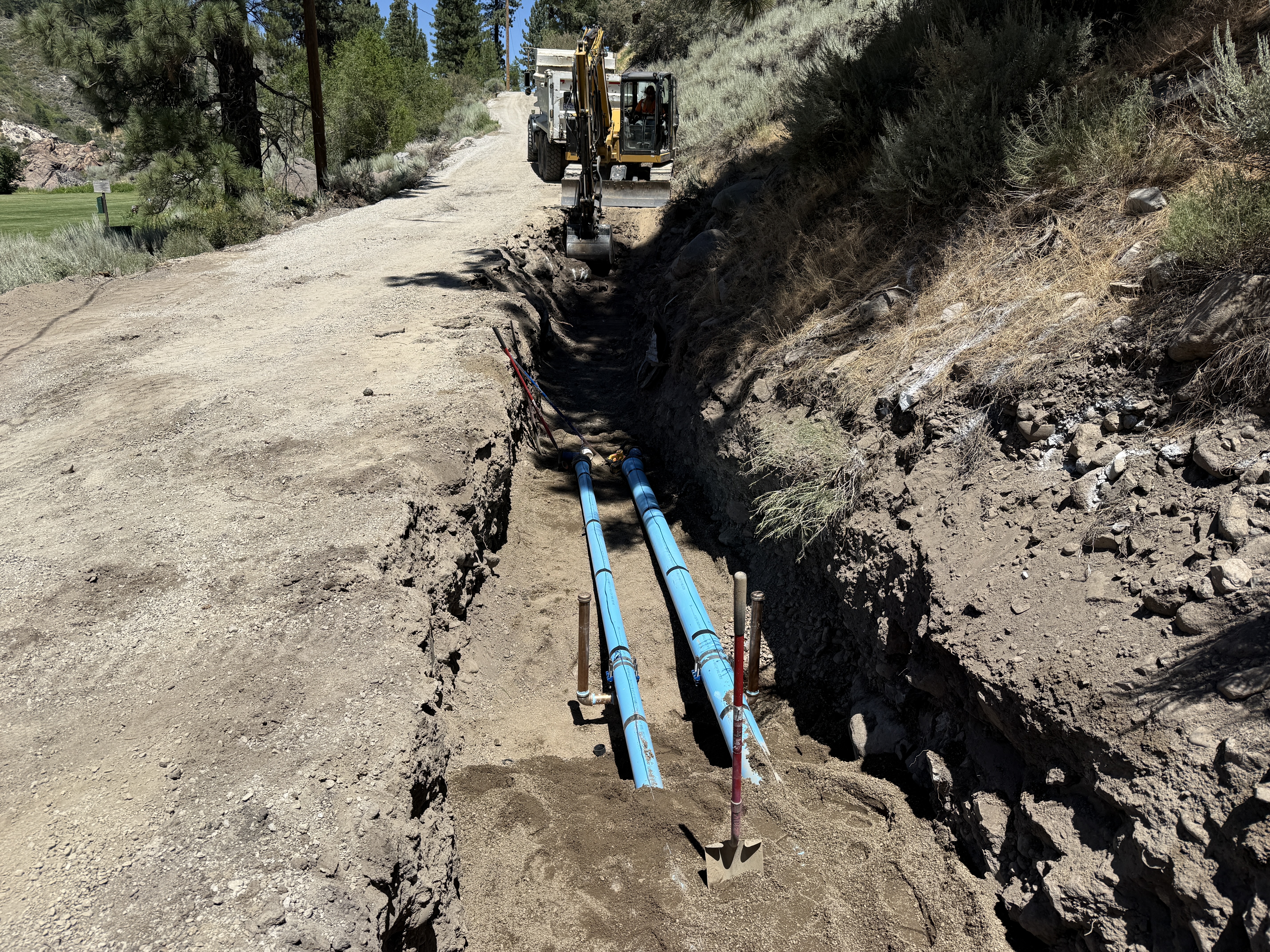 A trench runs along a dirt road with two blue pipelines installed within it. An excavator is parked near the trench, suggesting ongoing or recent digging activity. The trench edges are uneven, and a shovel is leaning against the trench wall. Vegetation and dirt indicate an outdoor setting.