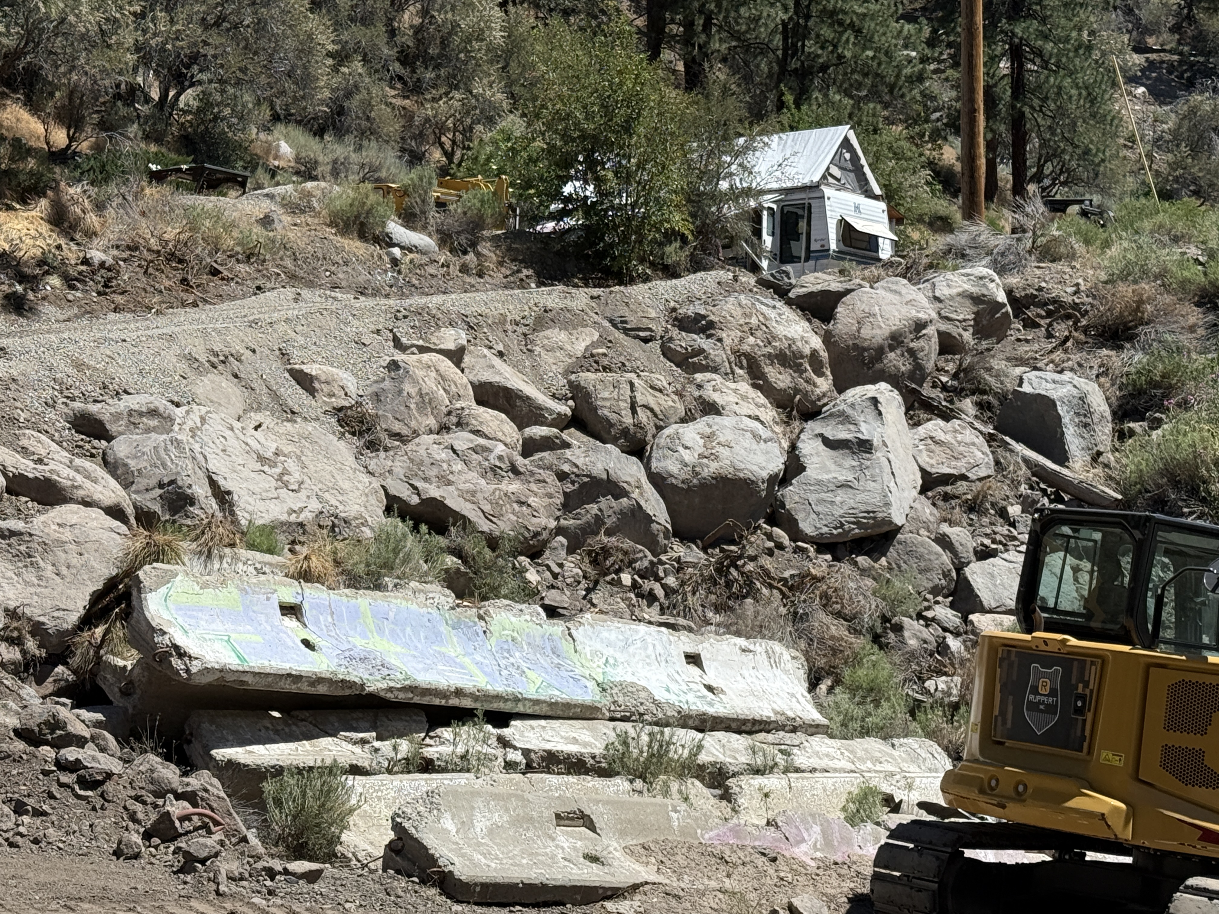 The image shows a yellow earth-moving machine on the right, near a rocky hillside. An old concrete slab with graffiti is situated in the center, partially covered by vegetation. In the background, a small white structure with a metal roof is visible, along with some additional construction vehicles. The primary activity appears to be related to earth-moving or site grading operations.