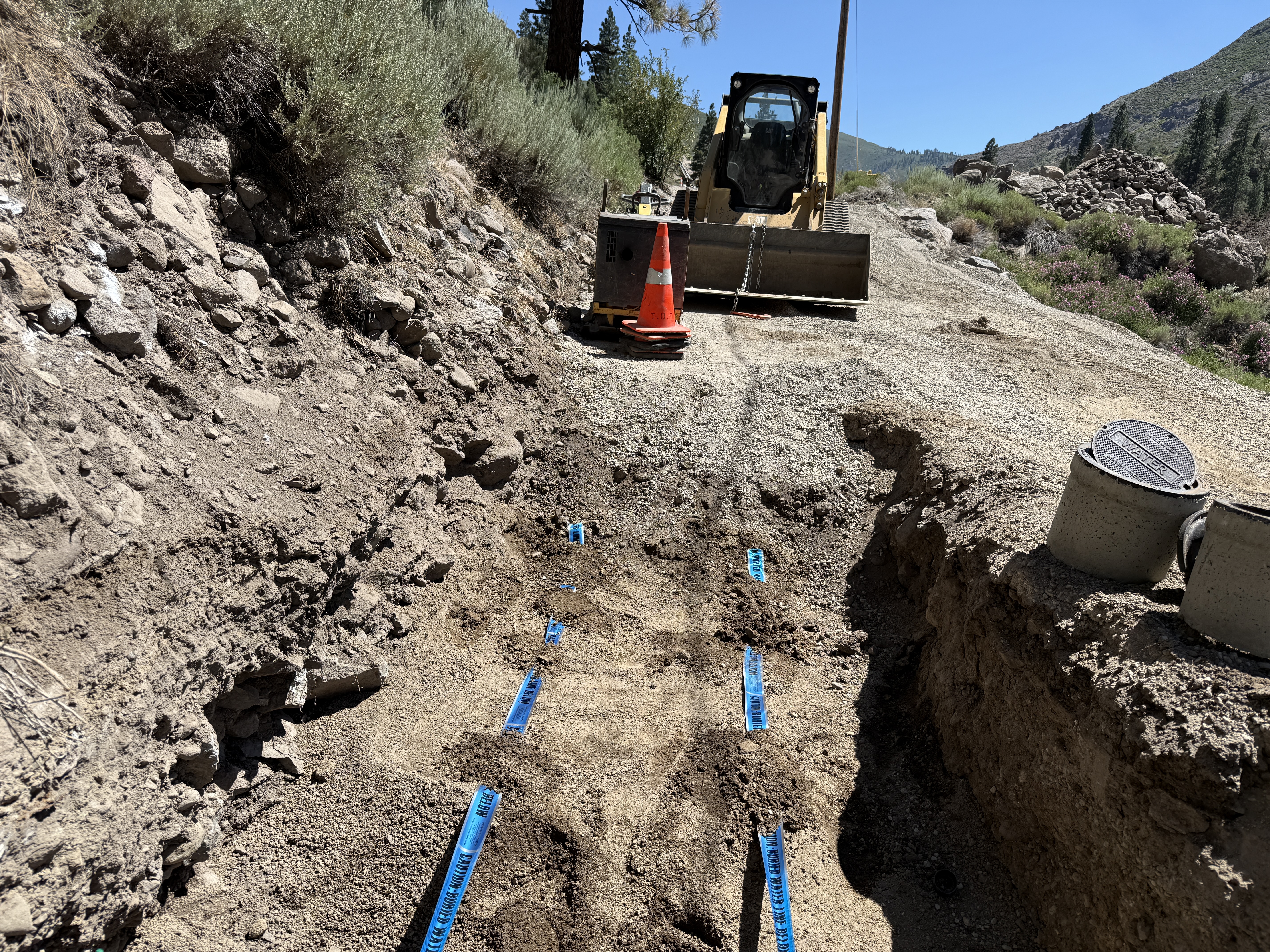 The image shows a trench being excavated along a dirt road next to a hillside. There is a loader positioned on the road, and blue underground warning tape is laid out in the trench. The area is open with gravel and loose soil, and the weather appears clear and sunny.