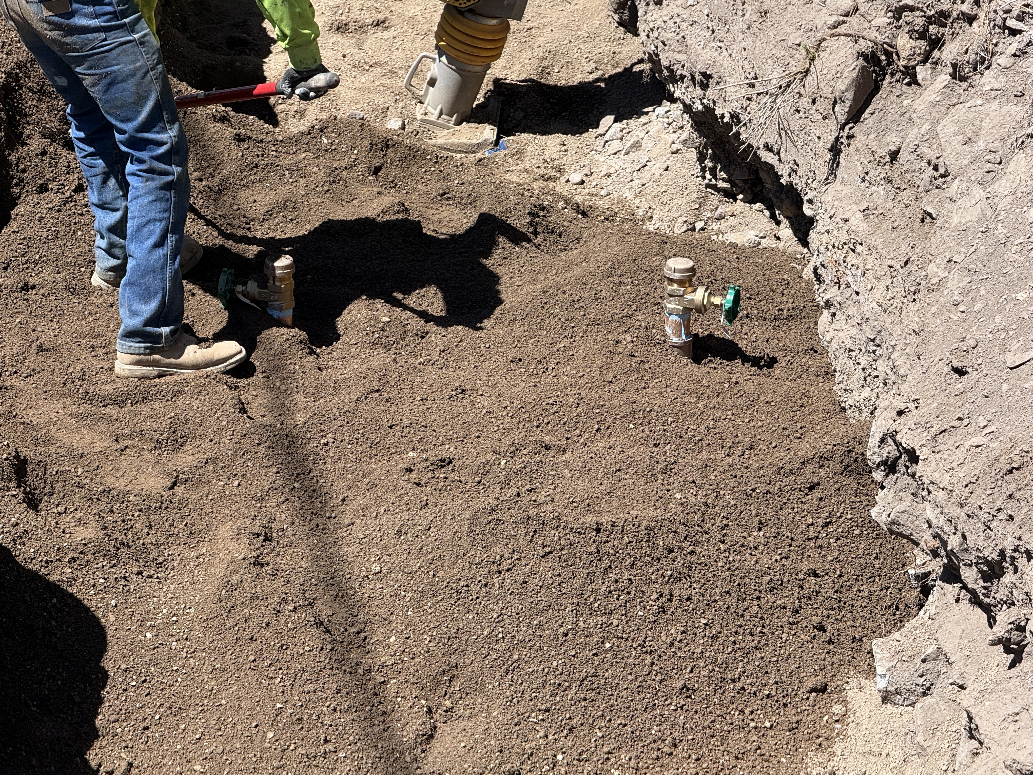 Two workers are engaged in backfilling a trench where pipeline shut-off valves are installed. Soil is being compacted and graded around the valves using hand tools and a plate compactor. The workers wear appropriate PPE including high-visibility clothing and work boots. The trench shows evidence of recent excavation, but the exact phase of work is uncertain.