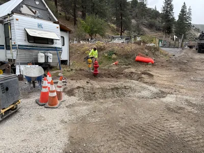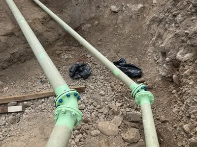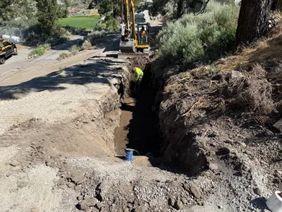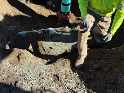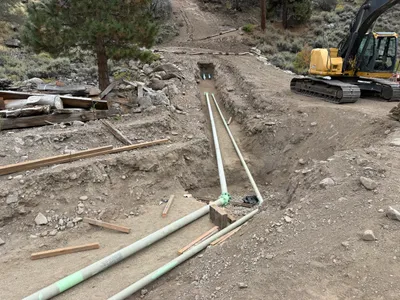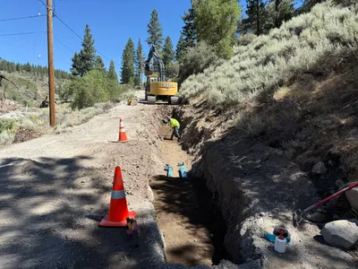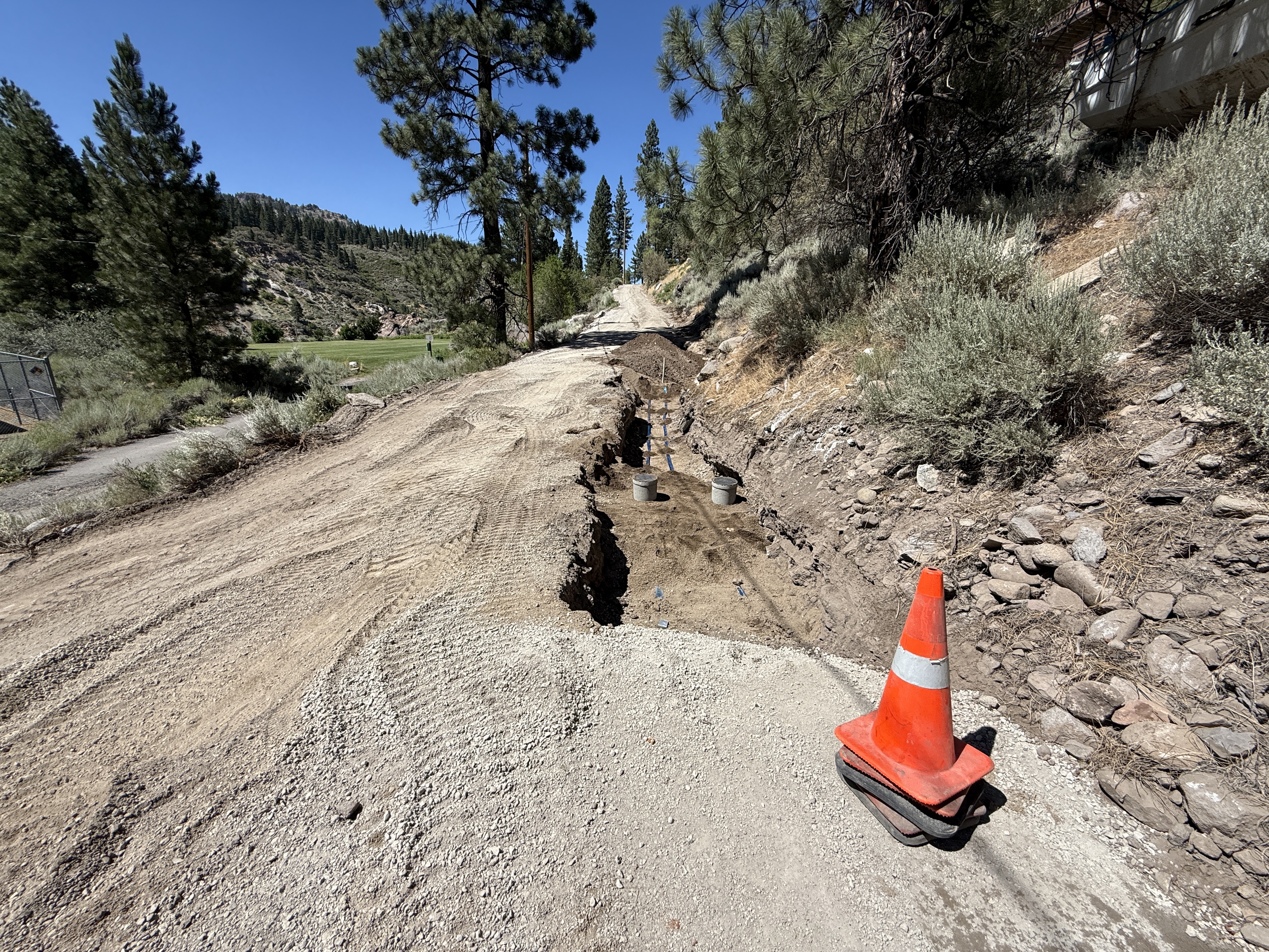 The image shows a trench being dug along a dirt path with vegetation on both sides. The trench runs parallel to the path and there are three visible cylindrical markers in the trench. An orange traffic cone is placed near the edge of the trench for safety. The path appears uneven with a significant amount of loose dirt.