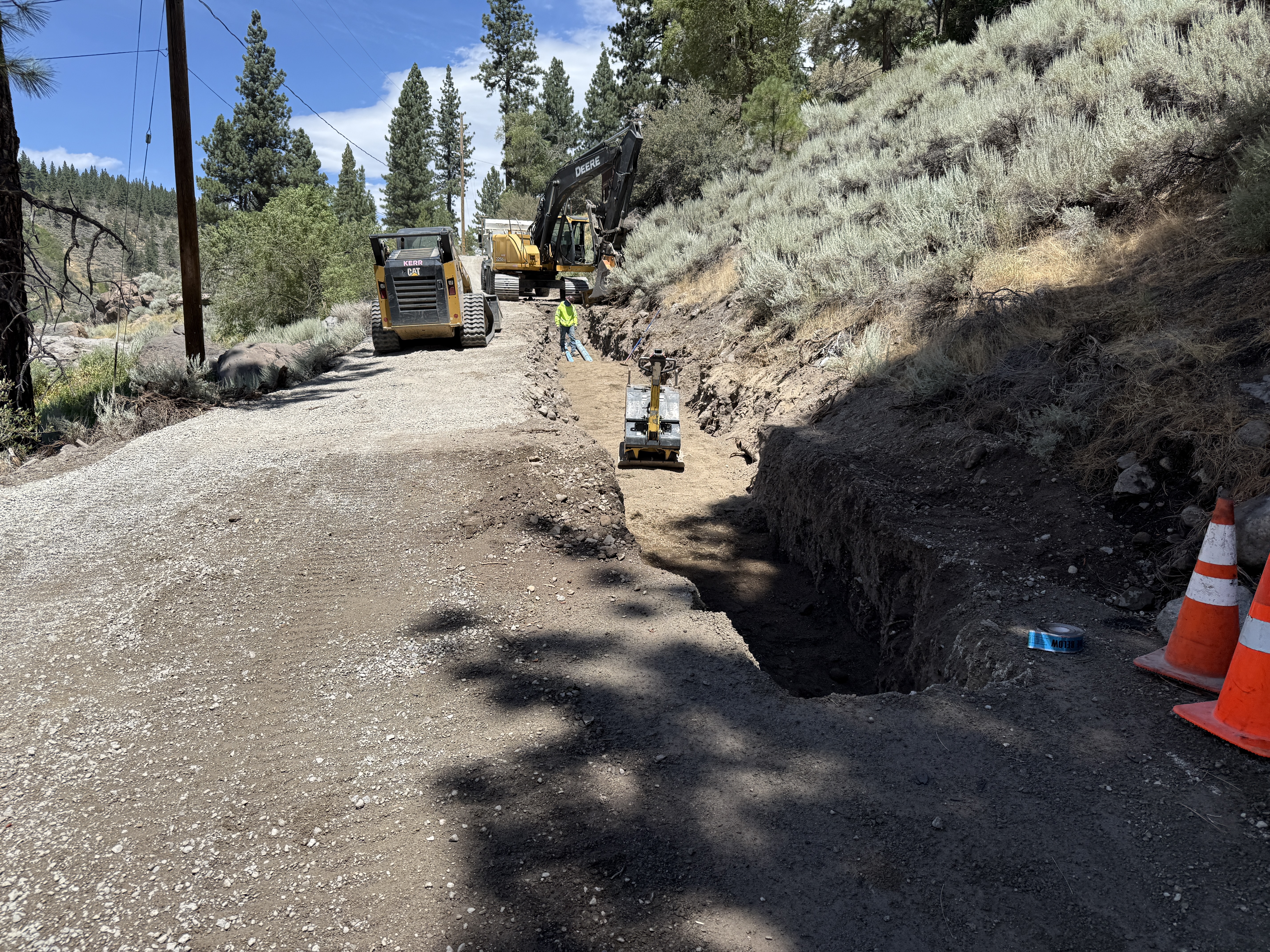 The image shows a trench being dug alongside a gravel road with heavy machinery present, including a large excavator. Orange traffic cones, a construction worker in safety gear, and a utility trench are visible. The trench runs parallel to the road, indicating land clearing for potential underground work.