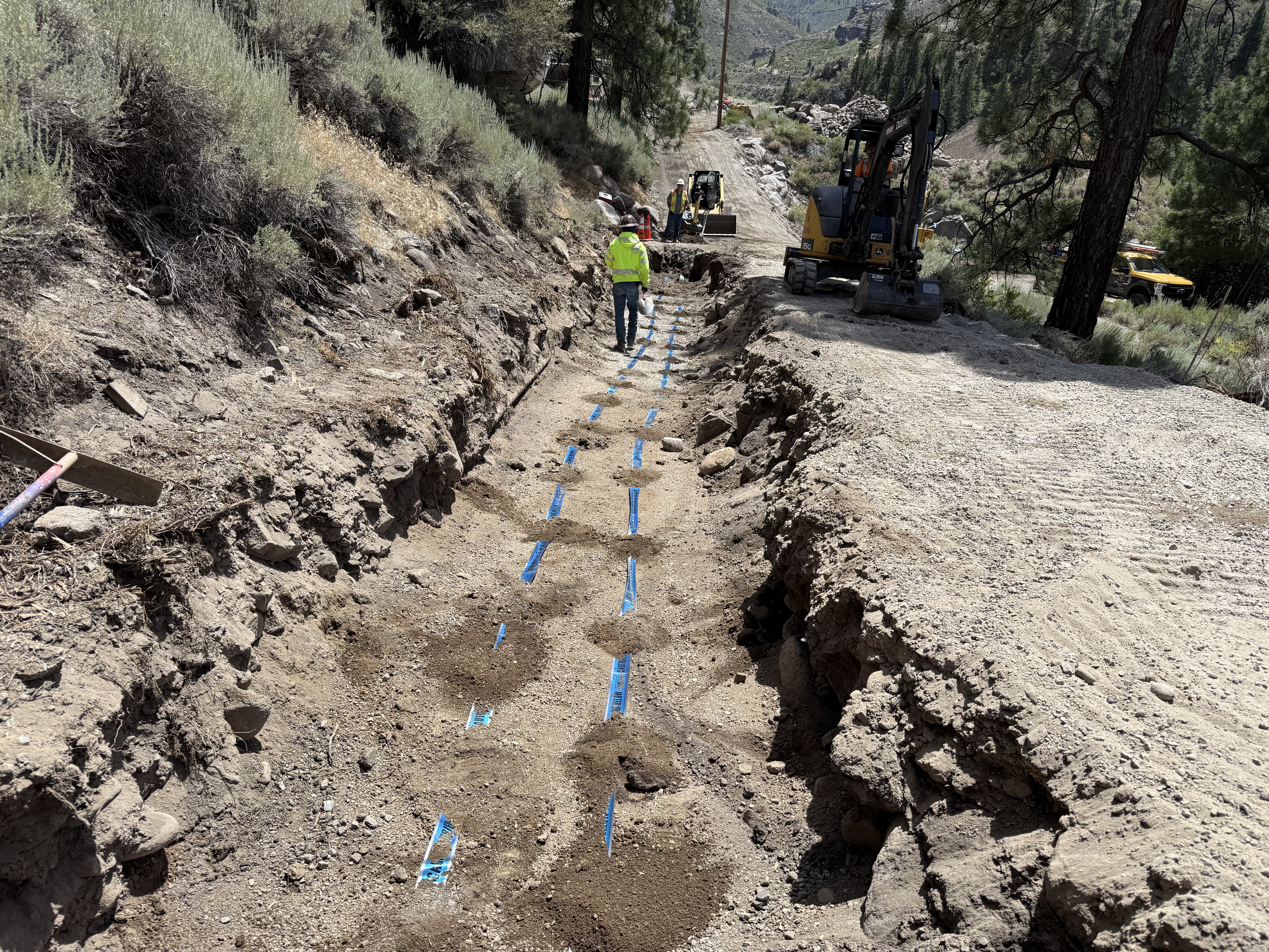 An open trench is visible running through a dirt path with blue marking tape laid within. A worker in a hi-vis vest and hard hat is seen walking in the trench. Excavation machinery is present beside the trench, and the surrounding terrain is rough and uneven. The specific purpose of the blue tape and trench remains unconfirmed but suggests pipeline installation.