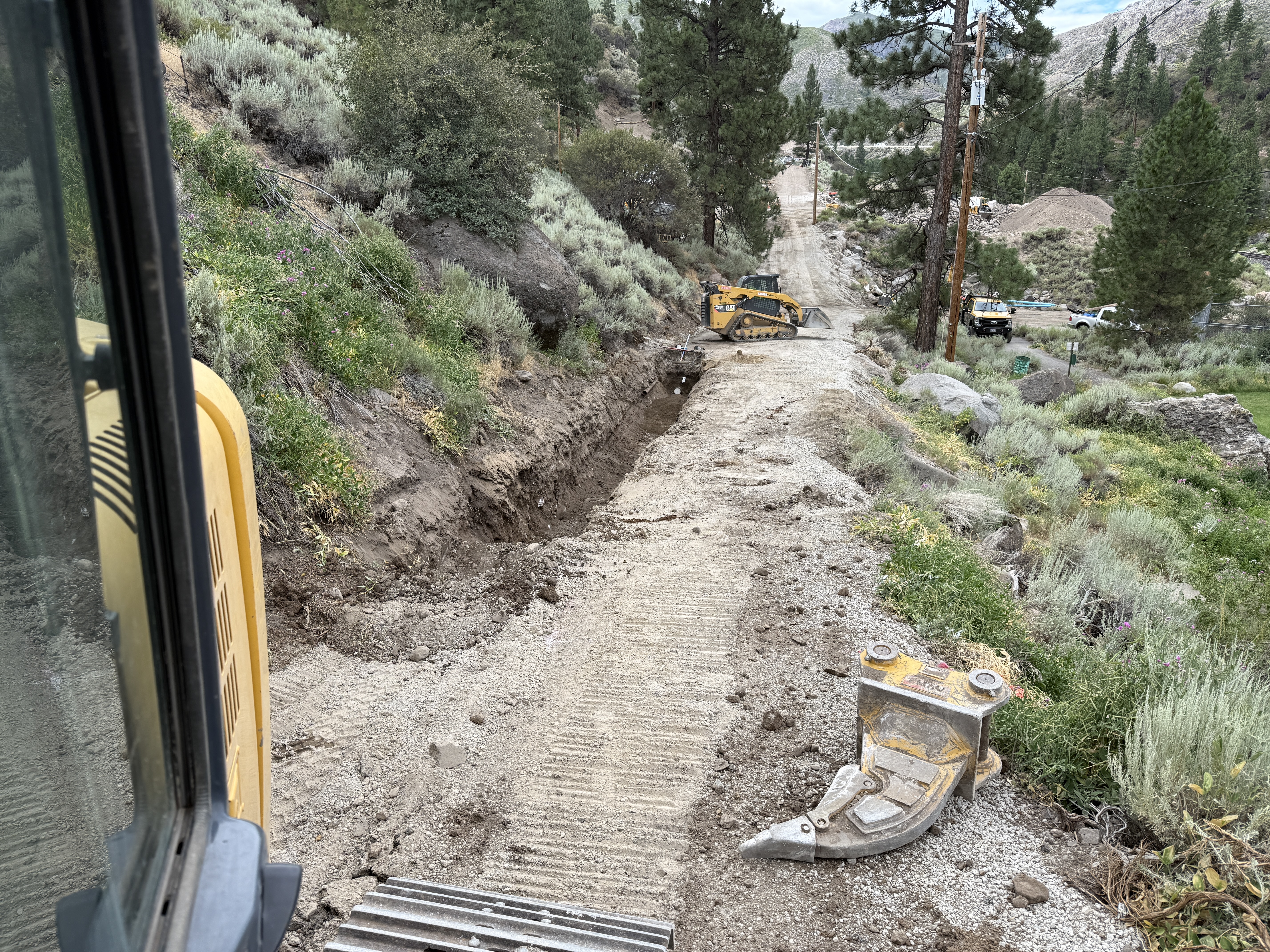 The image shows a trench being excavated along a dirt and gravel path. A piece of heavy machinery is visible on the left side, with another machine further down the path working near the trench. A trenching attachment lies on the ground next to the trench. Vegetation is sparse around the work area, and the path continues down a slope with trees on both sides.