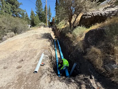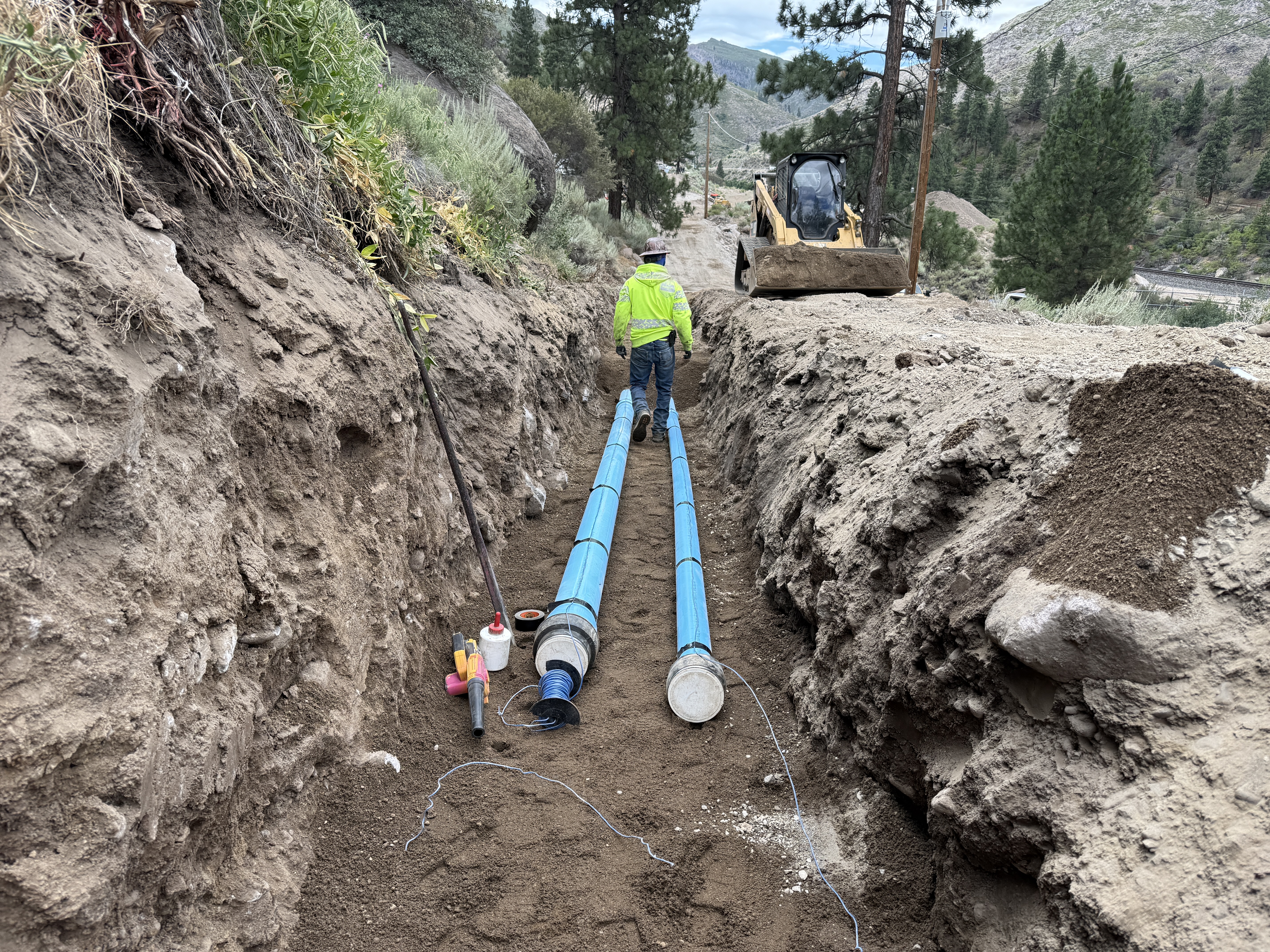 The image shows a trench with two blue pipes placed along the bottom. A worker in a hi-vis vest and hard hat is inspecting or working near these pipes. An excavator is positioned at one end of the trench, possibly used for trenching or backfilling. The surrounding area has natural rocky soil and vegetation.