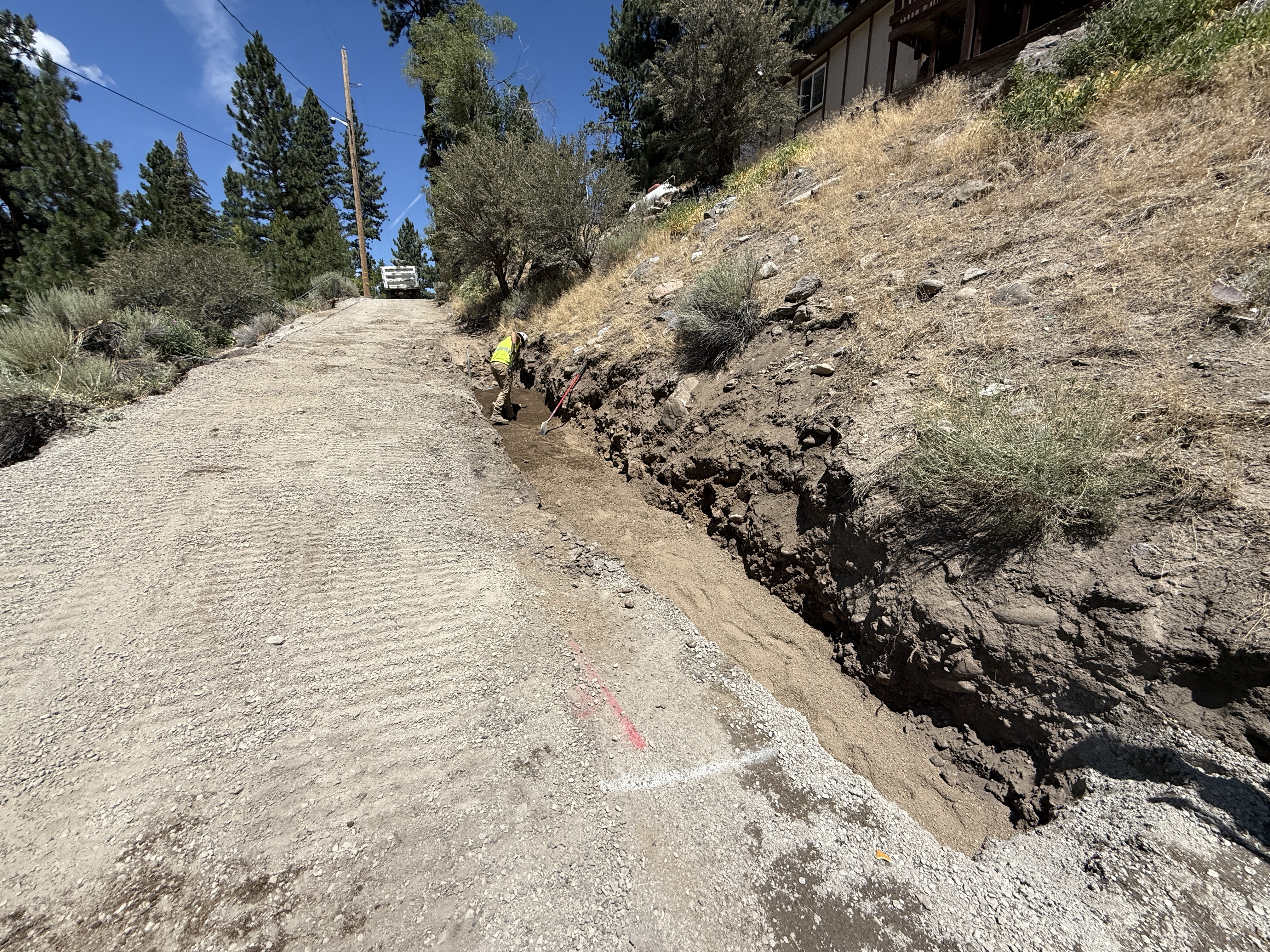 The image displays a person in a hi-vis vest working with a shovel in a trench alongside a graded dirt road. The trench is dug into a slope with soil and loose rocks visible. Trees and a structure can be seen in the background uphill from the trench. The road appears to be unpaved and runs adjacent to the excavation site.