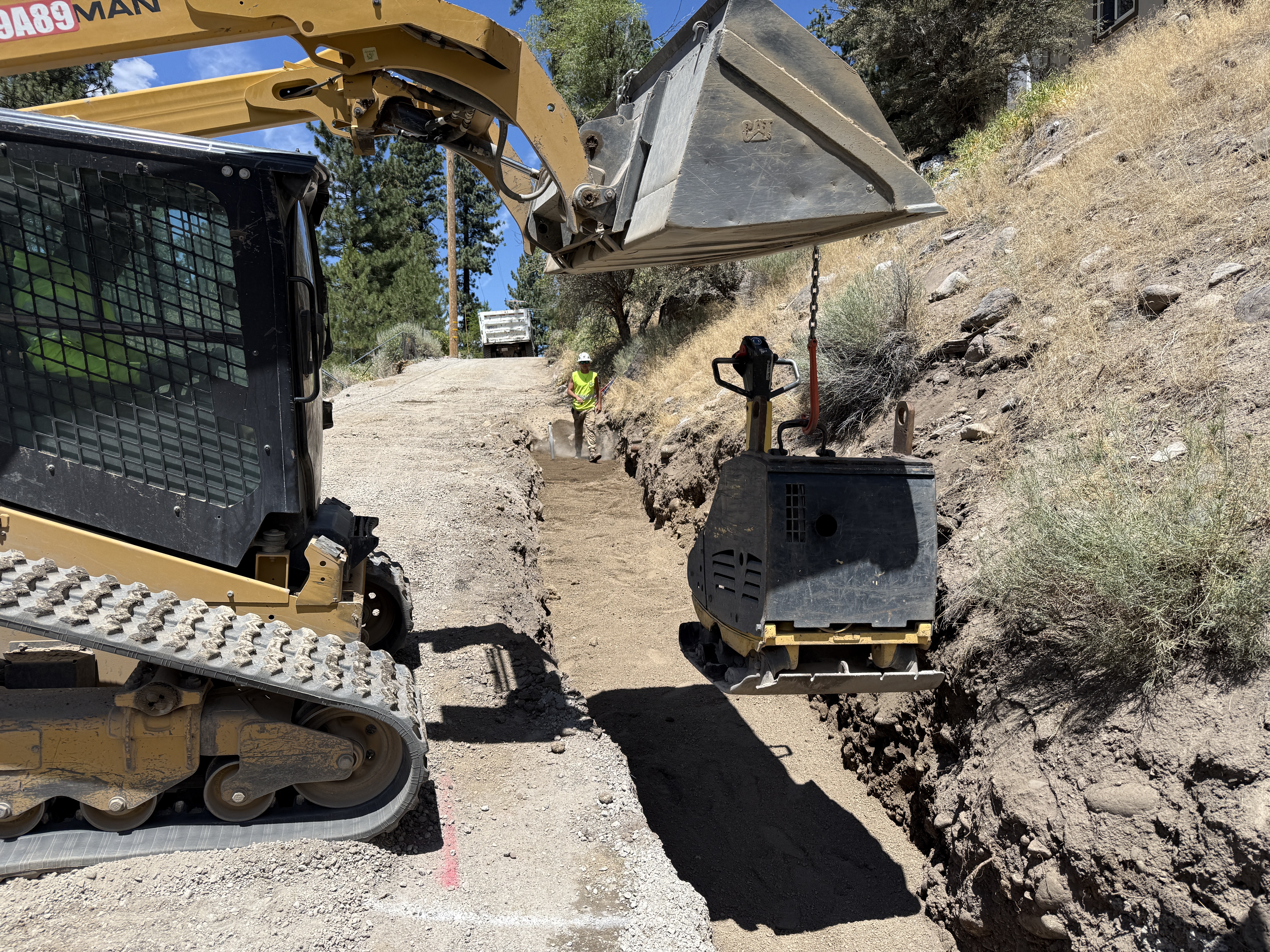 A tracked excavator is positioned on a dirt path with its arm extended, holding a vibrating plate compactor over a trench. A worker in high visibility clothing stands nearby, possibly observing or guiding the operation. The trench runs parallel to a slope, and soil is visible both in the trench and on the path. The photo was taken in daylight with clear weather conditions.