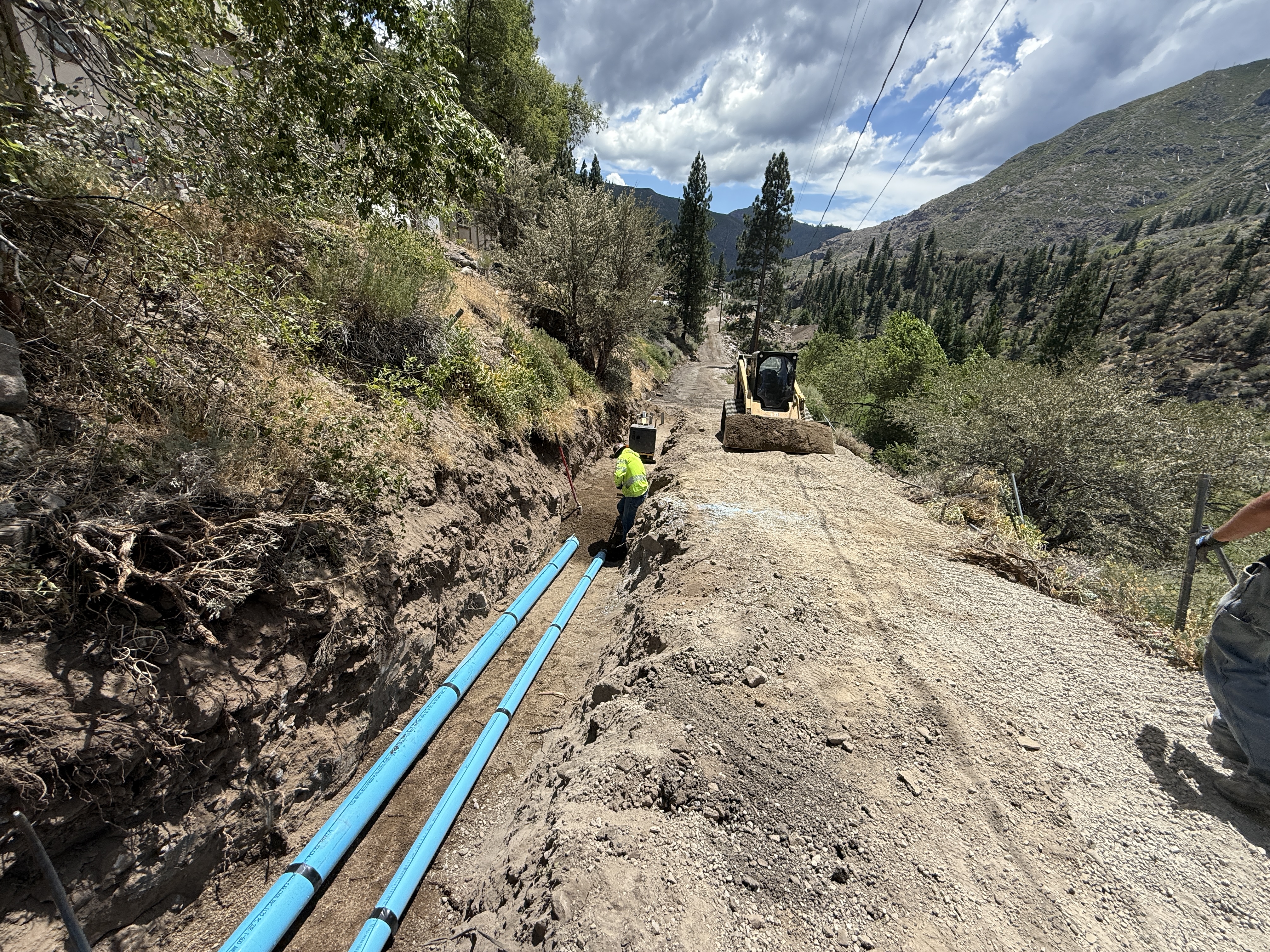 The image shows a trench with blue pipes being installed along a dirt road with adjacent trees and slopes. A worker in hi-vis clothing is standing in the trench, and a bulldozer is positioned at the edge of the trench. The setting is a mountainous area with clear weather.