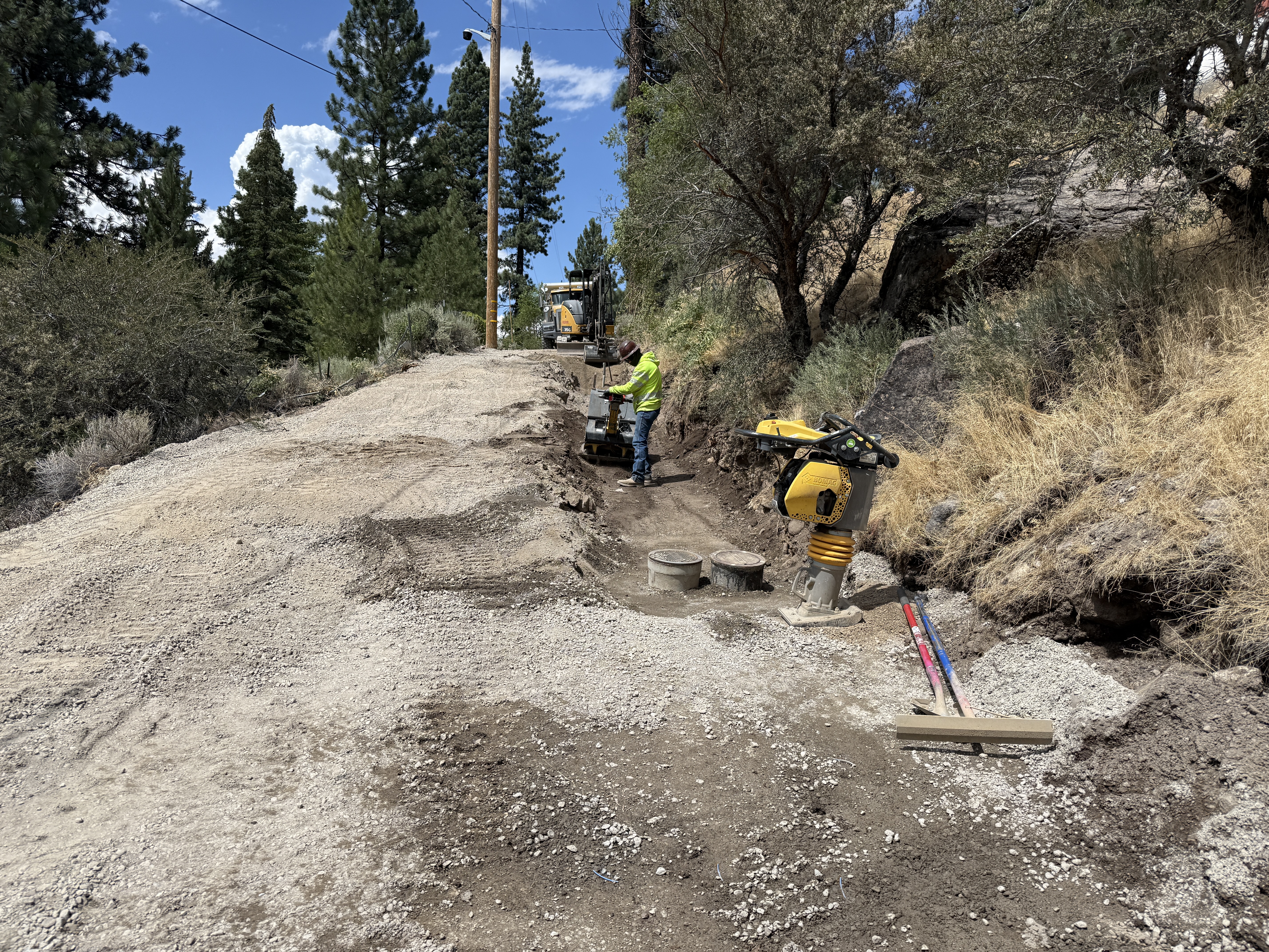 The image shows a construction site where site grading is in progress. A worker in a hi-vis vest operates near a compactor stationed on the side of a dirt path. The path is covered with gravel, and there are hand tools placed on the ground. The background includes trees and a partially visible heavy machinery in the distance.
