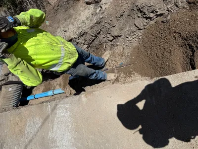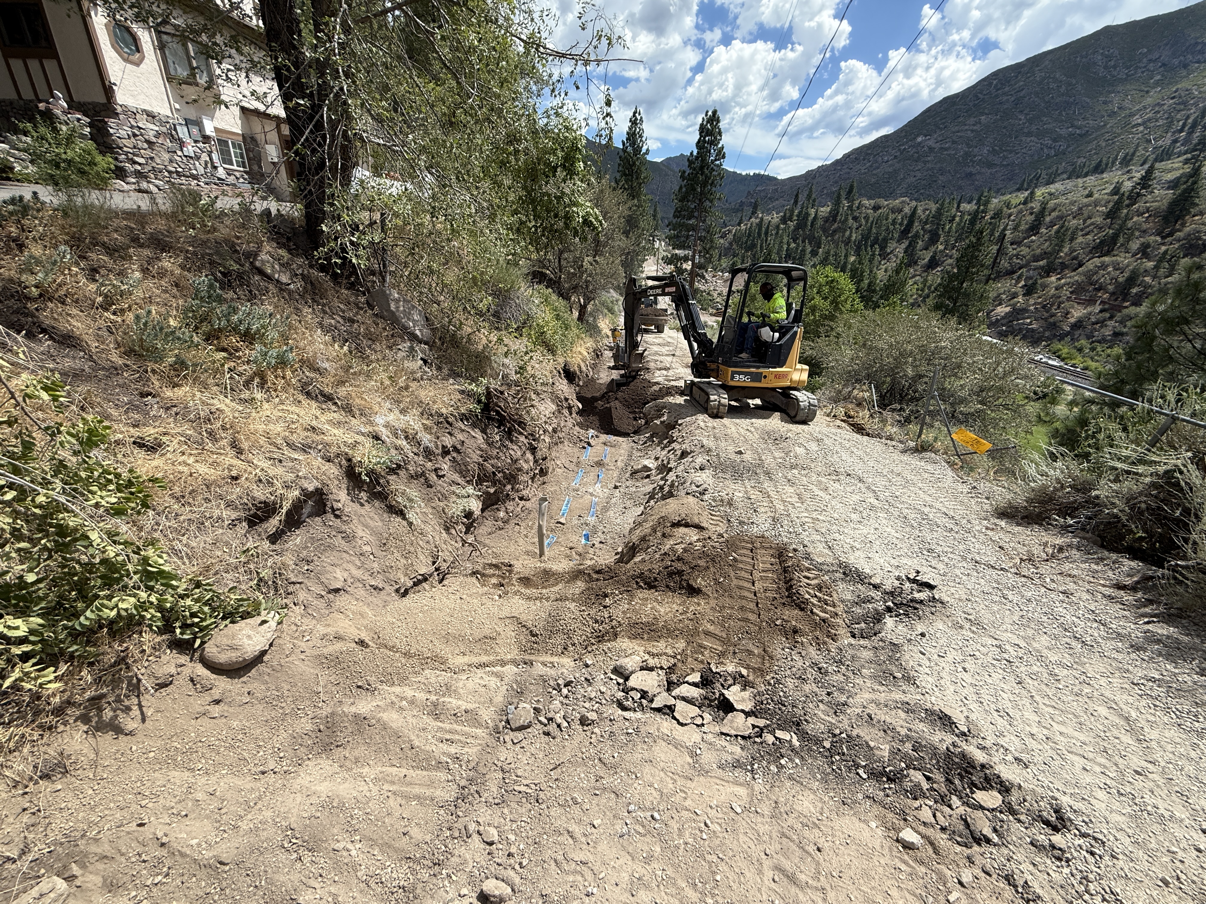 An open trench runs along a dirt path, with a small excavator actively digging or preparing the trench further. The trench is bordered by loose soil and rock on one side, with visible marks from excavation. The background shows a mountainous area with trees, and one operator is visible in the excavator, wearing appropriate PPE. The trench may be for pipeline or utility installation, but this is not explicitly visible.