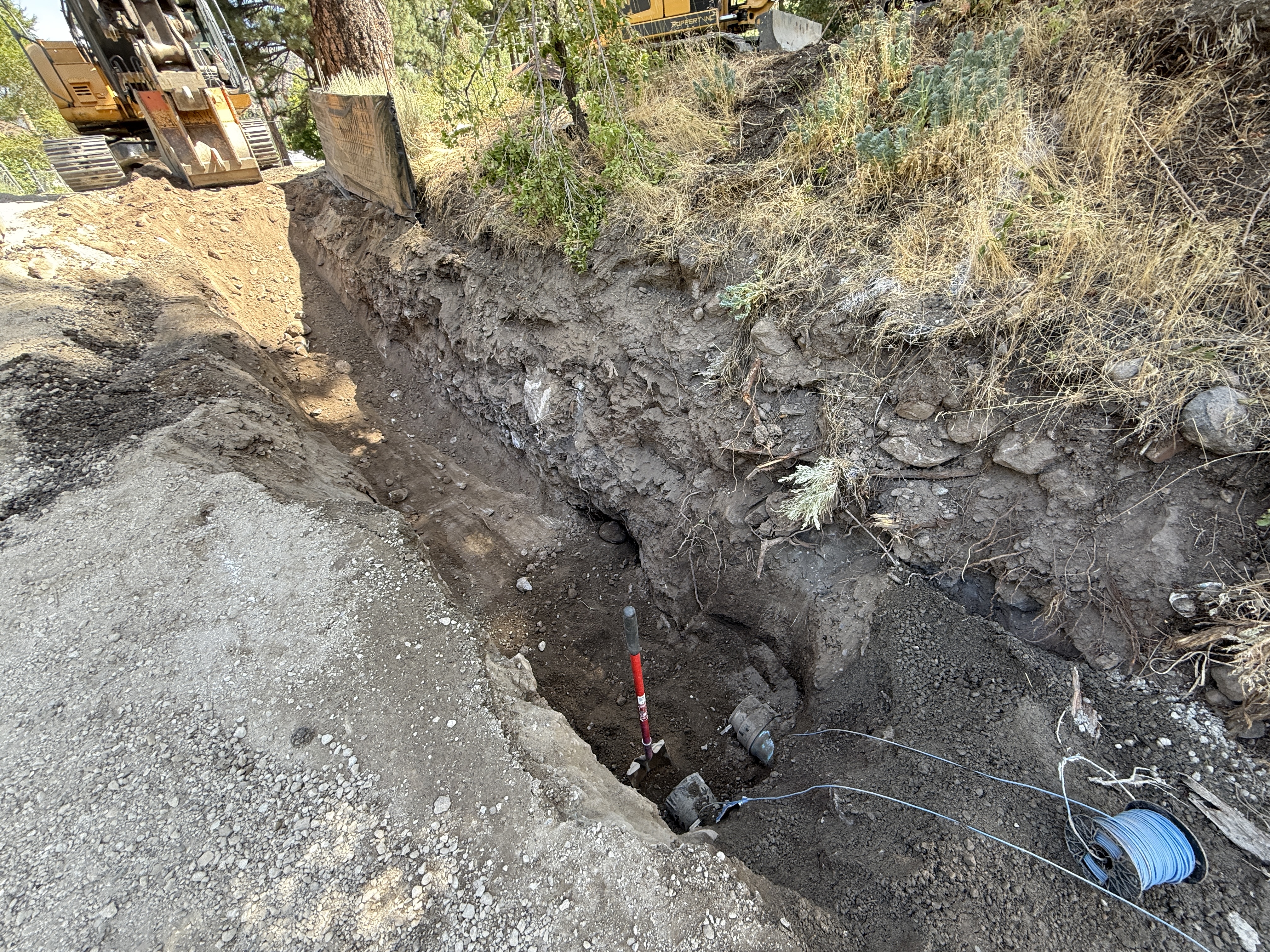A trench is visible in the foreground, with an excavator positioned at the edge. The trench appears to extend into the hillside, with soil and rocky layers clearly shown. Cables and a tool are present at the bottom of the trench. Vegetation is seen on the unexcavated slope above the trench.